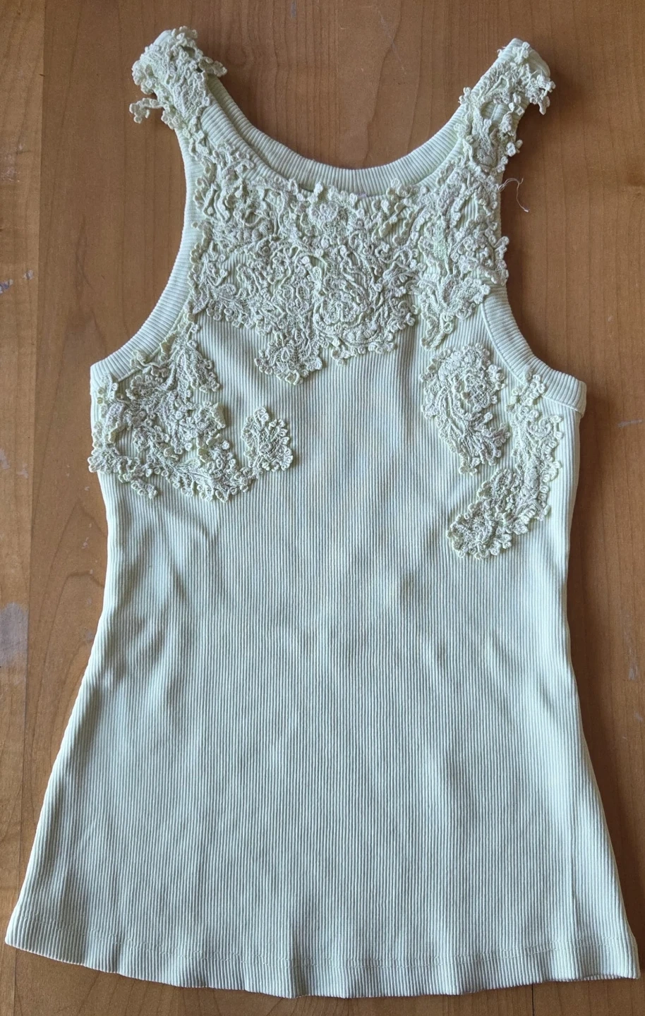 BRAND NEW WITH ORIGINAL TAGS, this beautiful Anthropologie tank top features delicate floral lace appliqué detailing over a soft ribbed knit fabric. The mint green color gives it a fresh, elegant look, perfect for spring and summer. Sleeveless with a flattering high neckline—easy to dress up or down.