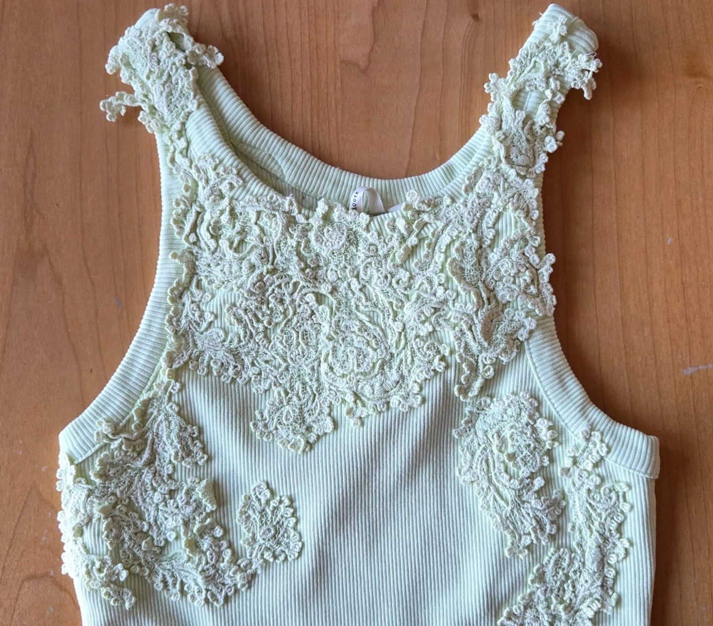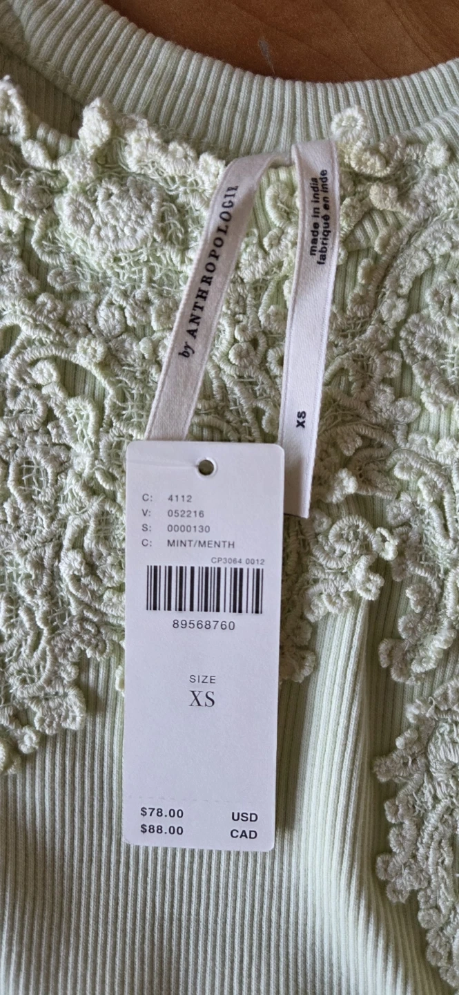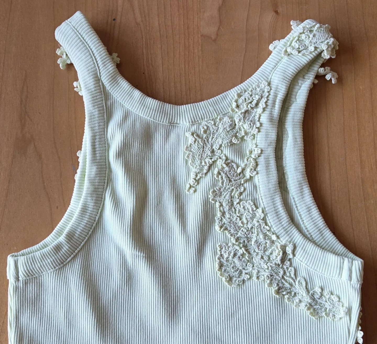BRAND NEW WITH ORIGINAL TAGS, this beautiful Anthropologie tank top features delicate floral lace appliqué detailing over a soft ribbed knit fabric. The mint green color gives it a fresh, elegant look, perfect for spring and summer. Sleeveless with a flattering high neckline—easy to dress up or down.