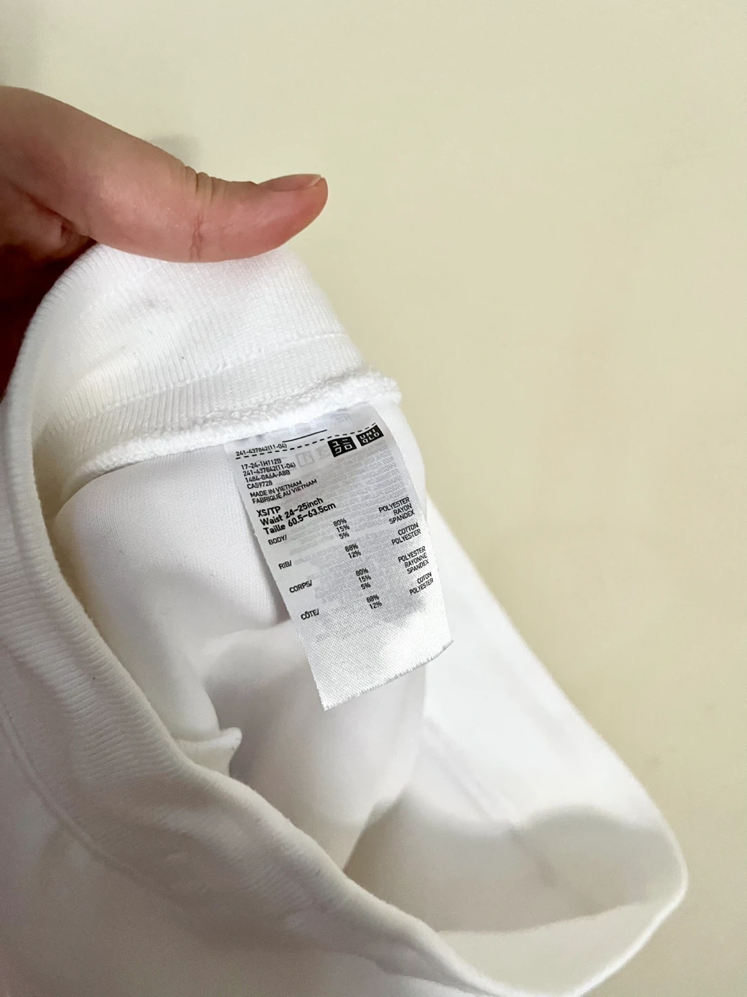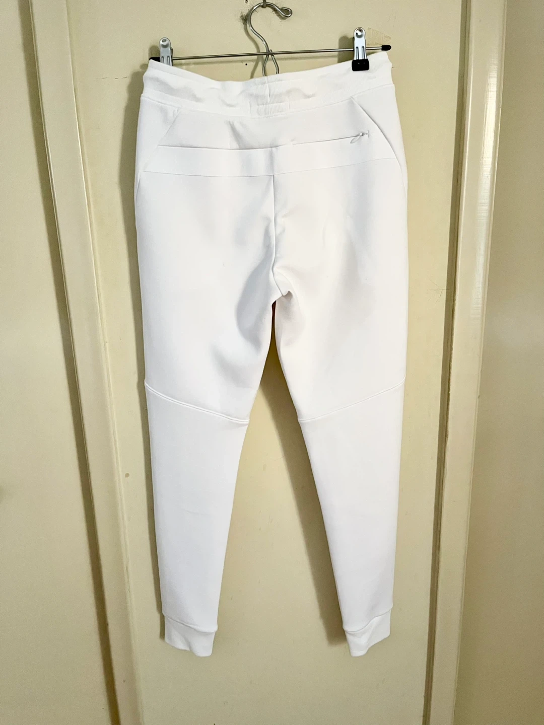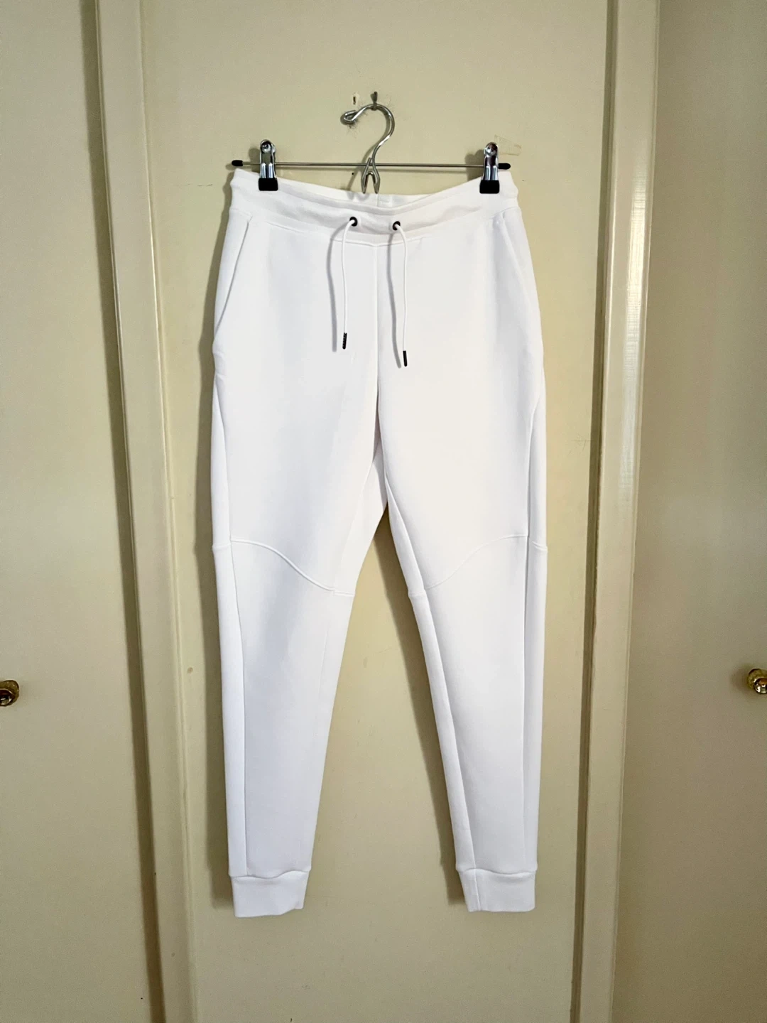 These white athletic joggers are made from a comfortable blend of polyester and spandex. They feature a drawstring waist and zippered pocket. A great option for everyday wear or light workouts!