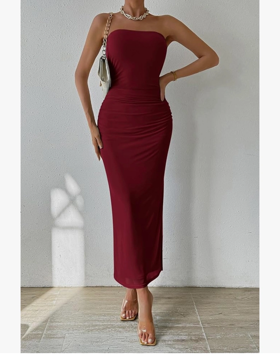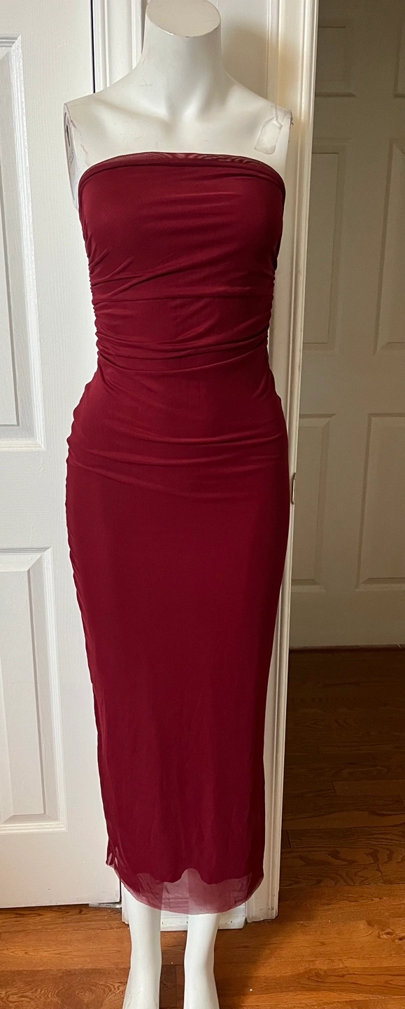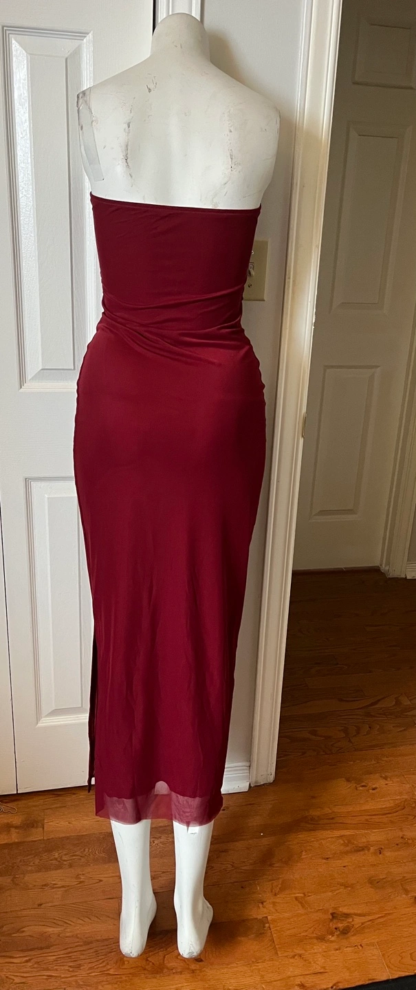 Pretty garden small size dress.This maroon strapless maxi dress features a flattering ruched detail. It's made of a stretchy material that hugs your curves. The dress has a thigh-high slit for added flair.