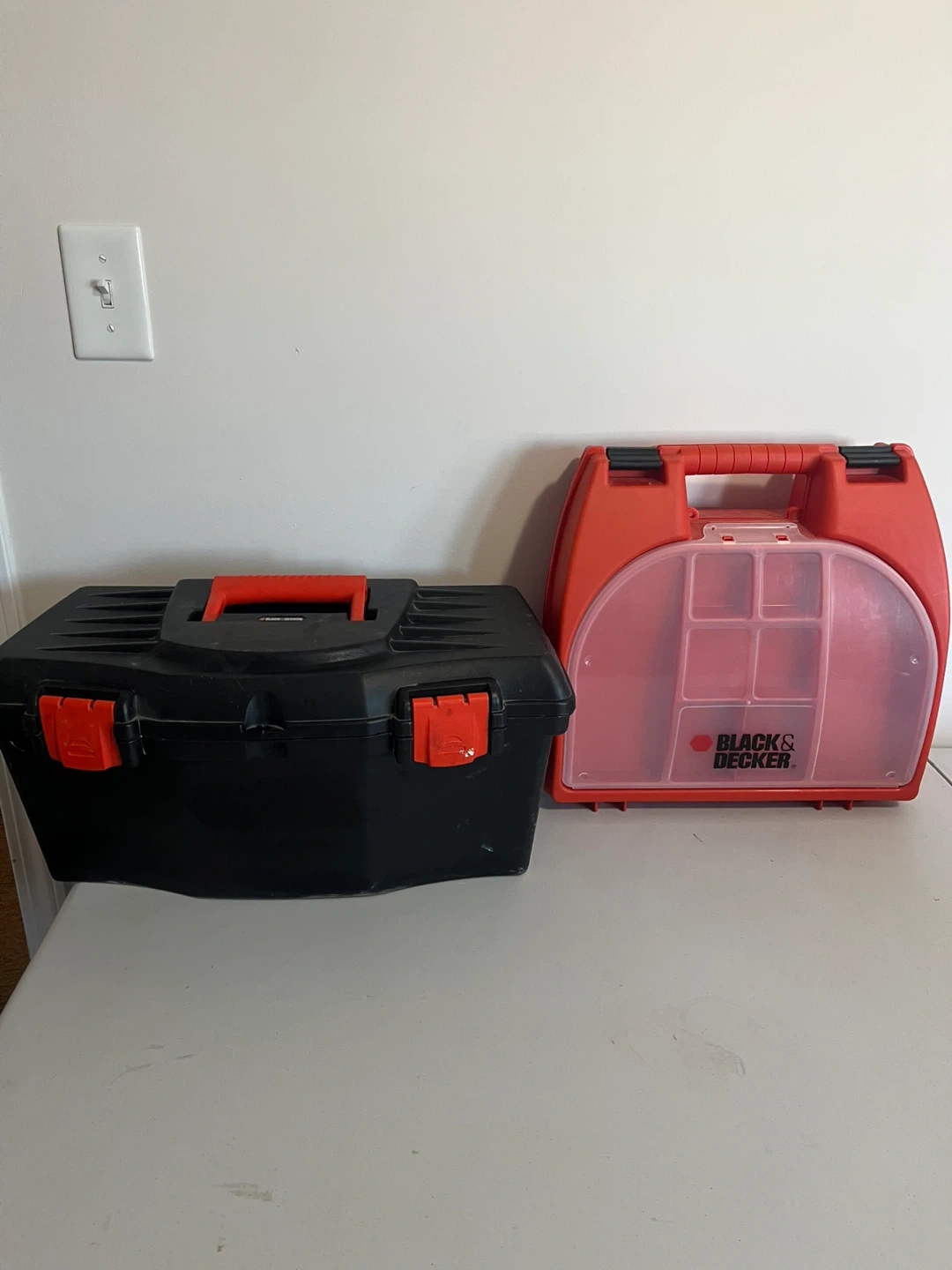 Two storage cases for tools and small parts. One black tool box with orange accents. One red and clear organizer case with multiple compartments and a Black & Decker logo. Perfect for craft supplies or hardware.