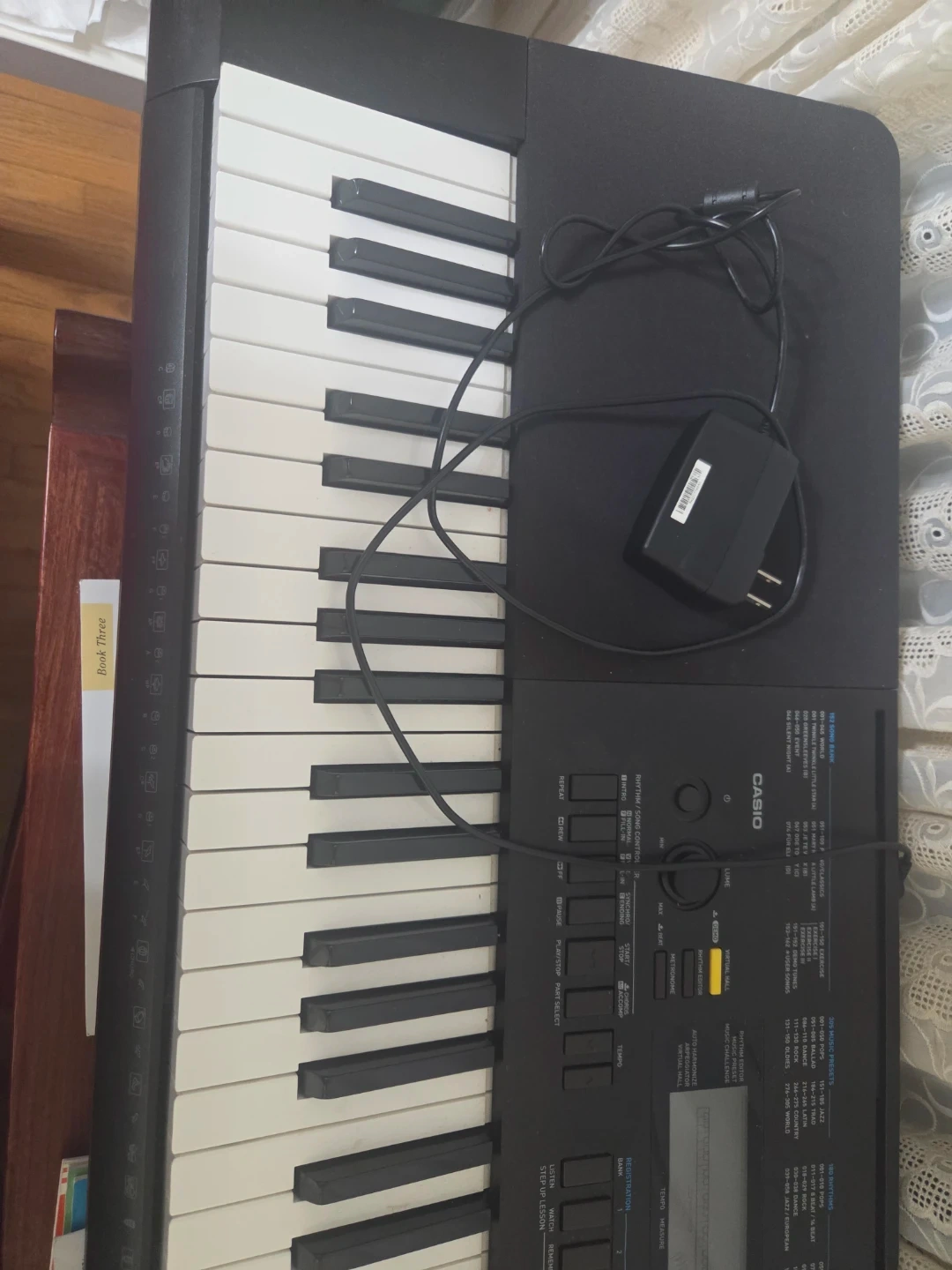This is a Casio WK-245 electronic keyboard. It comes with a power adapter. It's a great instrument for beginners to learn on!