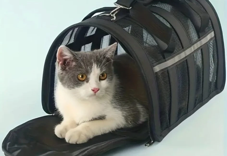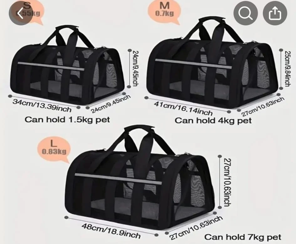 This is a ventilated pet carrier bag, perfect for transporting small pets like cats and small dogs. It's made with durable mesh for breathability. Multiple sizes are available, with this one measuring 34cm x 24cm x 24cm and capable of holding a pet up to 1.5kg.