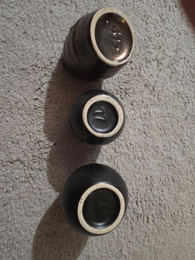 Stunning mid-century modern (1950s–60s) Israeli pottery ashtray set. 3 handcrafted pieces from the Bauhaus-influenced golden era of Tel Aviv/Jerusalem studios. Matte glazes, organic shapes, and sgraffito details make these collectible gems or perfect catchalls/trinket dishes today. Excellent vintage condition – no chips/cracks, just authentic firing texture. Barrel-shaped brown matte ashtray (mold #417, spout for ash) – ~4" tall. Raku-fired green patina cup ashtray (#17 stamp) – ~3" tall, rustic iridescent finish. Geometric black/green sgraffito vase ashtray ("Israel" export stamp) – ~4" tall, abstract scratched motifs. Rare matched trio – harder to find complete amid the MCM revival. Ideal for collectors, coffee tables, or desk decor.