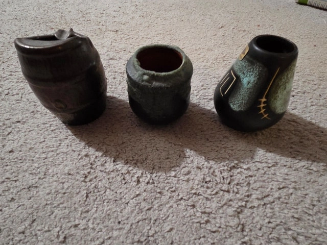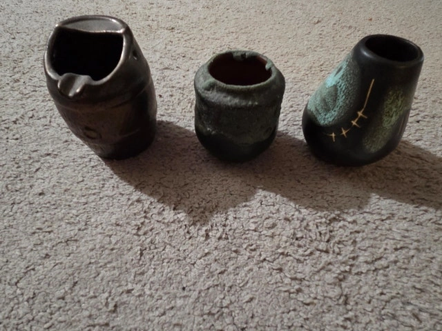 Stunning mid-century modern (1950s–60s) Israeli pottery ashtray set. 3 handcrafted pieces from the Bauhaus-influenced golden era of Tel Aviv/Jerusalem studios. Matte glazes, organic shapes, and sgraffito details make these collectible gems or perfect catchalls/trinket dishes today. Excellent vintage condition – no chips/cracks, just authentic firing texture. Barrel-shaped brown matte ashtray (mold #417, spout for ash) – ~4" tall. Raku-fired green patina cup ashtray (#17 stamp) – ~3" tall, rustic iridescent finish. Geometric black/green sgraffito vase ashtray ("Israel" export stamp) – ~4" tall, abstract scratched motifs. Rare matched trio – harder to find complete amid the MCM revival. Ideal for collectors, coffee tables, or desk decor.