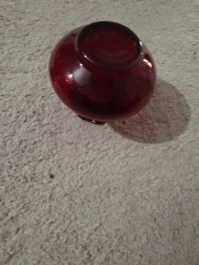 Classy vintage Anchor Hocking Royal Ruby Red glass bud vase from the 1930s–40s Depression glass era. Deep ruby red with classic scalloped/ruffled top and black accent rim. 3.5 inches tall – perfect size for a single rose or small bouquet. Excellent vintage condition – no chips, cracks, or cloudiness; beautiful shine and glow in the light. Iconic piece of American Depression glass, very collectible.