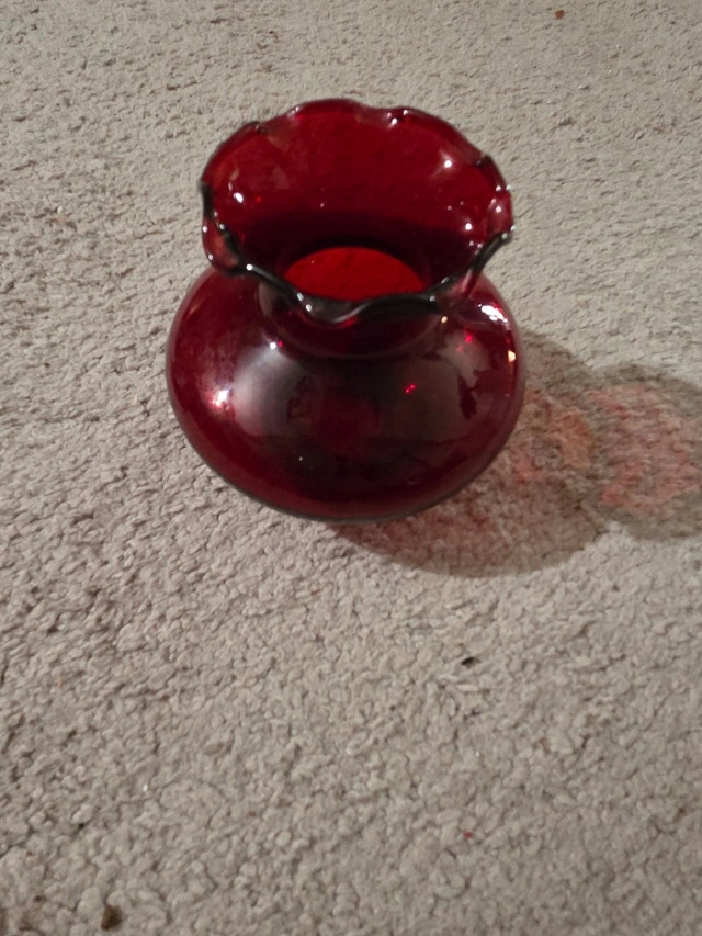 Classy vintage Anchor Hocking Royal Ruby Red glass bud vase from the 1930s–40s Depression glass era. Deep ruby red with classic scalloped/ruffled top and black accent rim. 3.5 inches tall – perfect size for a single rose or small bouquet. Excellent vintage condition – no chips, cracks, or cloudiness; beautiful shine and glow in the light. Iconic piece of American Depression glass, very collectible.