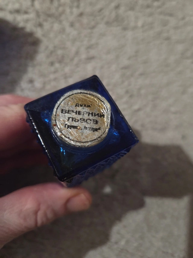 Matched pair of original Soviet-era blue glass perfume/cologne bottles from Gus-Khrustalny Factory. Textured cobalt blue crystal with gold screw caps – 4" and 5.25" high. Labels: "Goose Crystal Souvenir" + Dimitrov Winery "Recipe 9" (Bulgarian-Soviet cologne). Excellent condition – empty, no chips/cracks, labels/caps perfect. Classic 1960s–80s tourist souvenirs – rare complete set.