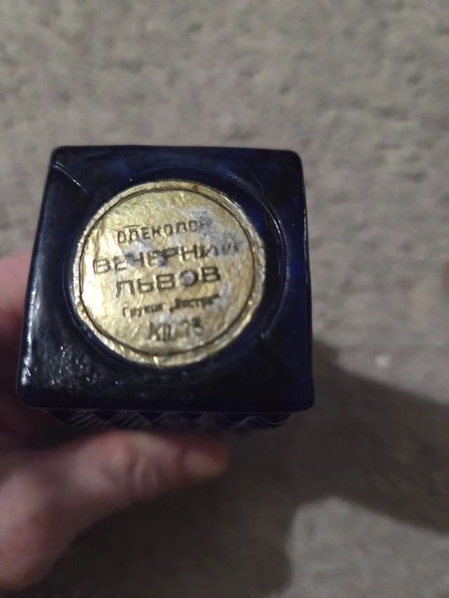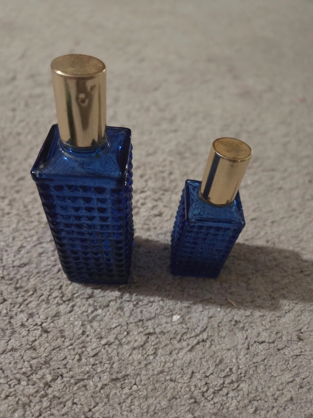 Matched pair of original Soviet-era blue glass perfume/cologne bottles from Gus-Khrustalny Factory. Textured cobalt blue crystal with gold screw caps – 4" and 5.25" high. Labels: "Goose Crystal Souvenir" + Dimitrov Winery "Recipe 9" (Bulgarian-Soviet cologne). Excellent condition – empty, no chips/cracks, labels/caps perfect. Classic 1960s–80s tourist souvenirs – rare complete set.