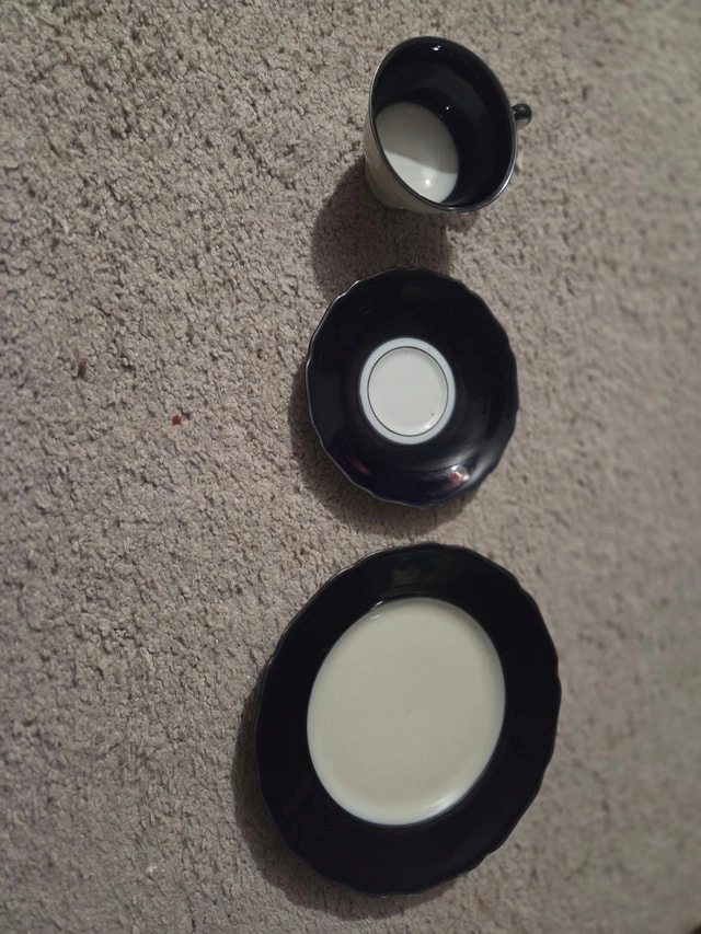 Elegant vintage German porcelain trio from Rosenthal Thomas (Bavaria, mixed 1928/1960s marks) in the timeless Mörfelden pattern – crisp white with glossy black scalloped rims and subtle gold banding. Perfect for tea lovers, collectors, or adding Art Deco flair to your table. Demitasse cup (~2oz espresso size) + matching saucer (3.5" dia), Bread & butter/dessert plate (4.5" dia), Luncheon plate (6.25" dia). Excellent condition: No chips, cracks, or gold loss; minor utensil marks from light use only. These scream mid-century European sophistication – mix with modern whites or build out a full service. The date mix (two 1928, one 1963-64) adds character without detracting from the matched elegance. For Sale By: Owner