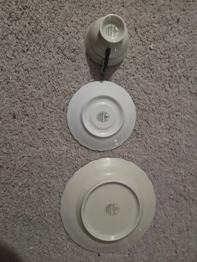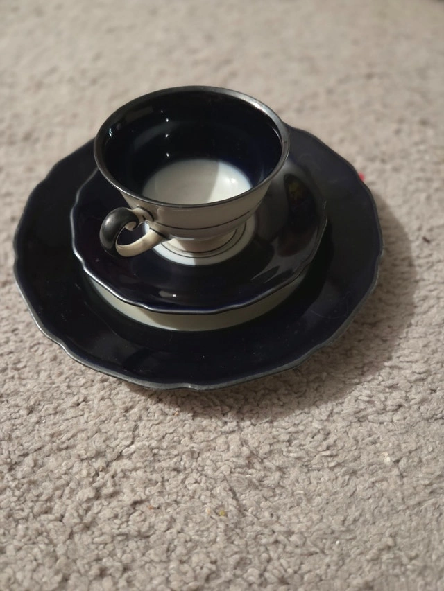 Elegant vintage German porcelain trio from Rosenthal Thomas (Bavaria, mixed 1928/1960s marks) in the timeless Mörfelden pattern – crisp white with glossy black scalloped rims and subtle gold banding. Perfect for tea lovers, collectors, or adding Art Deco flair to your table. Demitasse cup (~2oz espresso size) + matching saucer (3.5" dia), Bread & butter/dessert plate (4.5" dia), Luncheon plate (6.25" dia). Excellent condition: No chips, cracks, or gold loss; minor utensil marks from light use only. These scream mid-century European sophistication – mix with modern whites or build out a full service. The date mix (two 1928, one 1963-64) adds character without detracting from the matched elegance. For Sale By: Owner