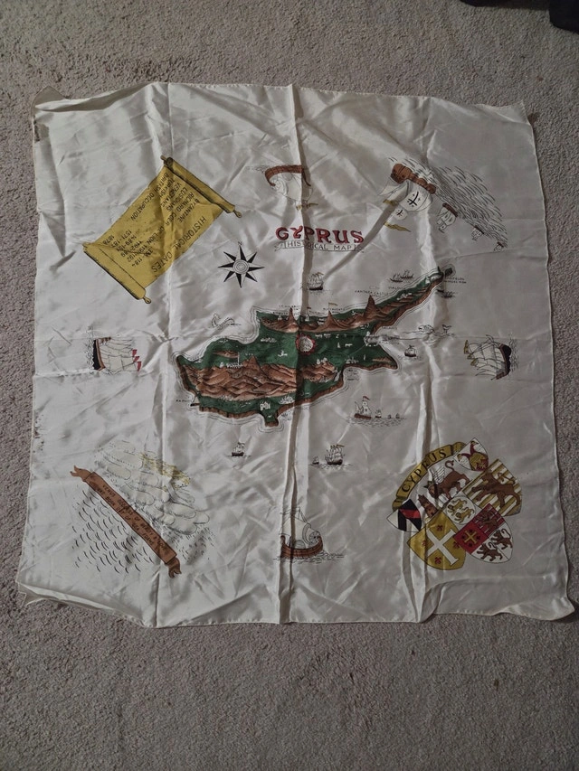 Rare 1970s silk souvenir scarf – “Cyprus Historical Map” by Richard Coer de Lion. 100% pure silk twill with hand-rolled edges, 30x30 inches. Perfect for wall hanging, framing, or wearable art. Shows a unified Cyprus before the 1974 partition, featuring a Venetian lion, Ottoman ships, Richard the Lionheart, Aphrodite, British colonial dates, and coat of arms. Very detailed and collectible. These were sold to British tourists and servicemen in the early 70s and are becoming hard to find in good condition. Condition: Normal vintage creasing throughout. Two small tears along the left edge (see photos). No stains or holes in the main design area, colors are still bright. Still perfectly usable as wall art, for a framing project, or easily wearable with the tears hidden.