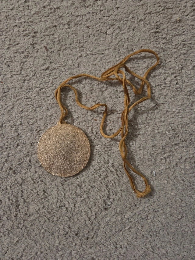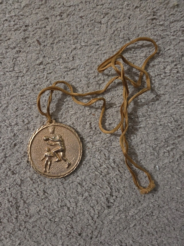 Cool vintage 1970s gold-tone basketball medal necklace – perfect for collectors or hoops fans! It's a heavy 2.25" diameter medal (60–70g) with a detailed relief of a player driving to the hoop. Comes with a woven ribbon cord. Good condition, no dents or major wear. Likely a high school/college amateur award from the era – unengraved but full of character. Great display piece or necklace for basketball enthusiasts.