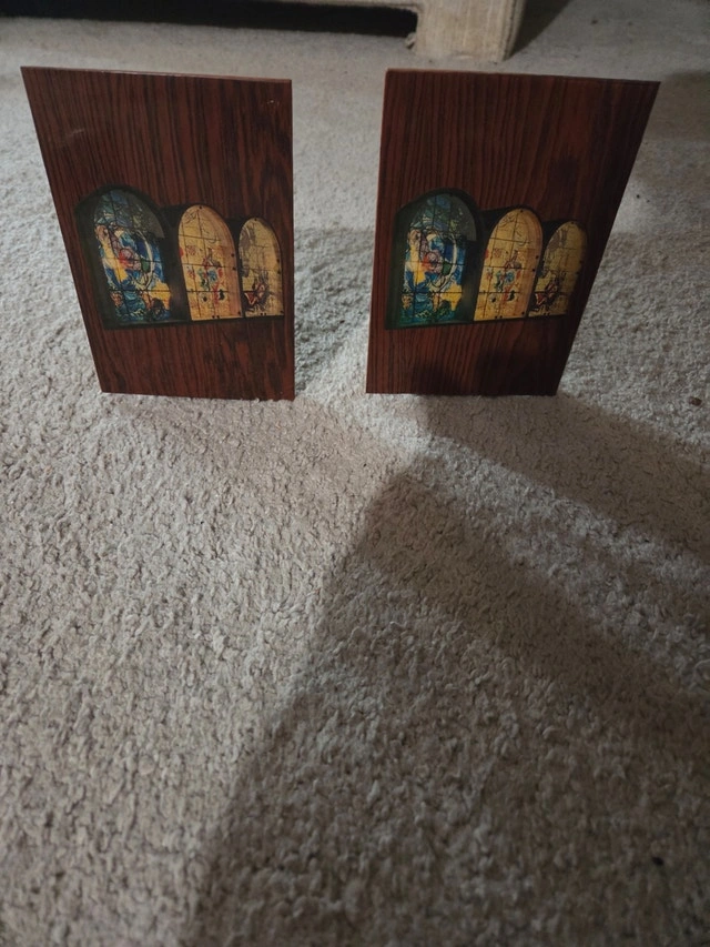Pair of vintage 1970s faux stained-glass triptych bookends. Each bookend has three arched “church-window” panels in amber, green, and blue with floral designs. They are 6" tall × 4" wide with solid wood bases and green felt bottoms. In excellent condition with no chips, cracks, or color fade. Perfect for paperbacks or as retro shelf decor.