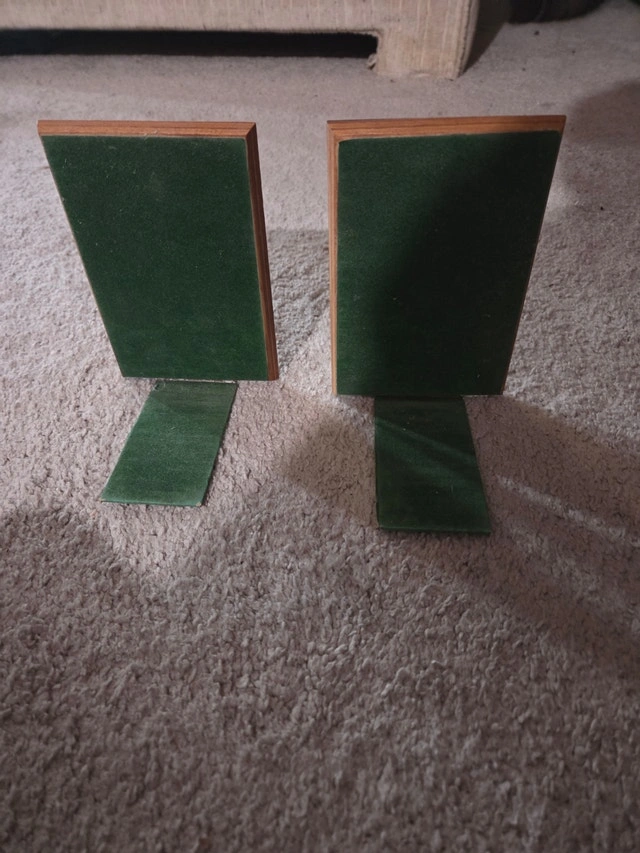 Pair of vintage 1970s faux stained-glass triptych bookends. Each bookend has three arched “church-window” panels in amber, green, and blue with floral designs. They are 6" tall × 4" wide with solid wood bases and green felt bottoms. In excellent condition with no chips, cracks, or color fade. Perfect for paperbacks or as retro shelf decor.