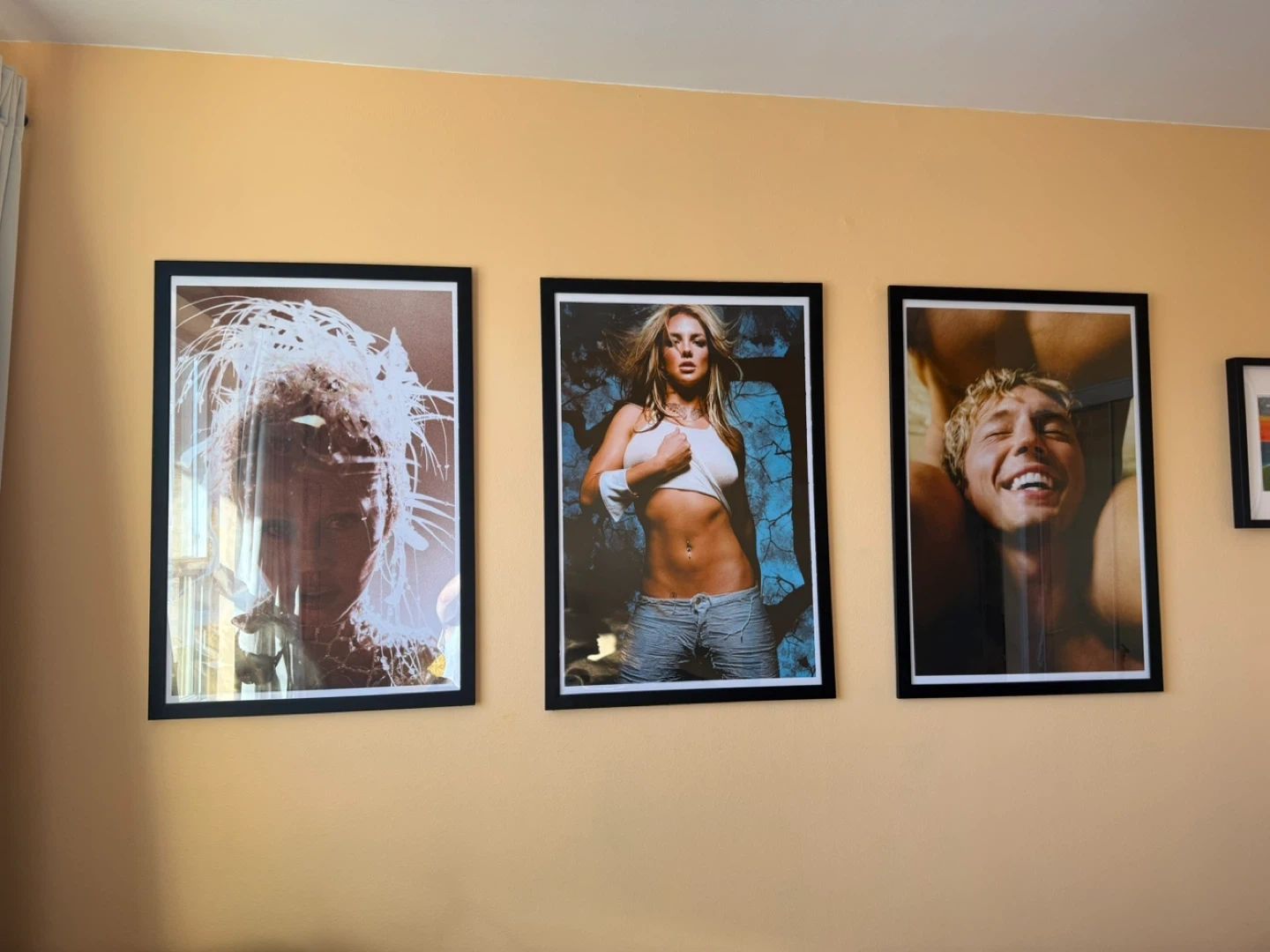 Three framed photos featuring well-known personalities. Each photo is presented in a black real wood frame with glass protection. These pieces are ready to hang and add character to any room.