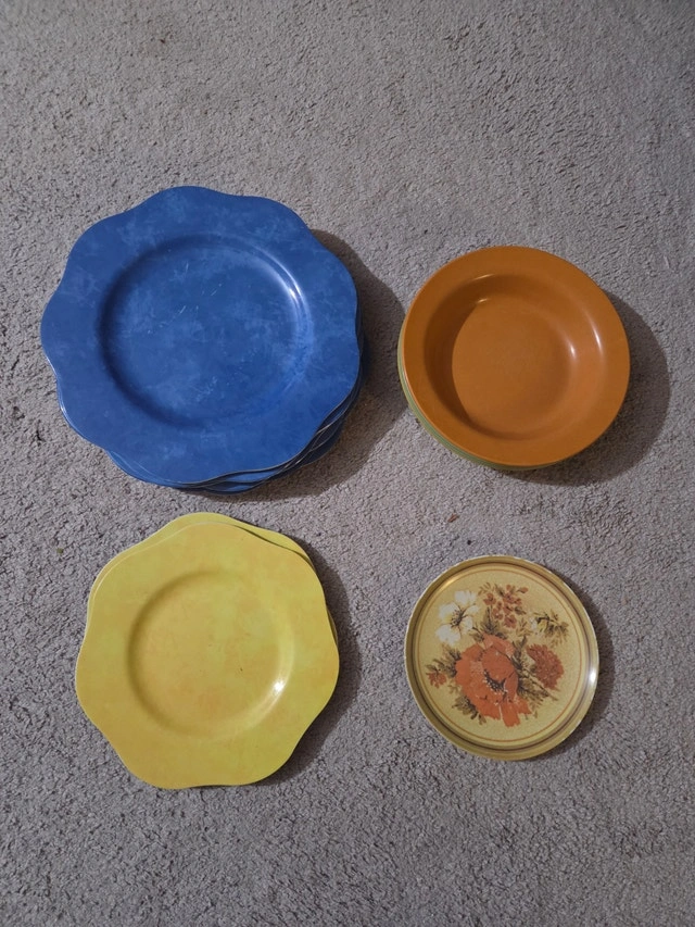 Set of 11 vintage hard-plastic picnic plates, 1970s-1980s style, all same pattern. Includes: 4 × 10.75" dinner plates, 4 × 8" salad/dessert plates, 2 × 8.5" lunch/side plates, and 1 × 6.5" bread/saucer plate. Good used condition with light scratches and utensil marks from normal use, but no cracks. They are still sturdy and clean. Perfect for cottage, camping, kids, or a retro kitchen.