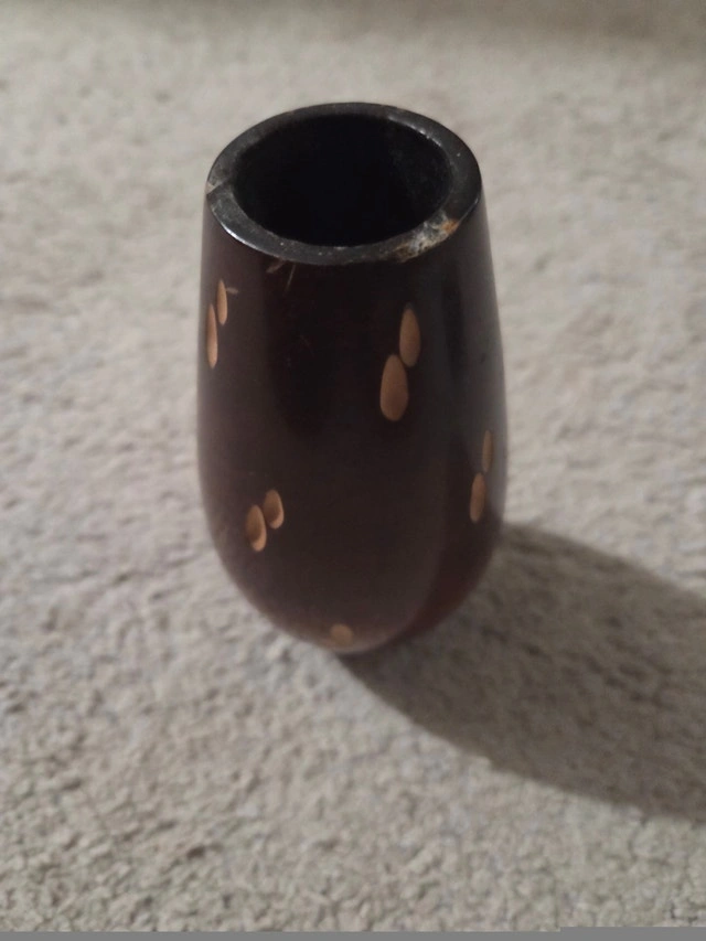 5.5" tall × ~2.5" wide, 130–140 g. Beautiful matte black glaze with a flared rim, has a studio pottery look. Excellent display condition – only a couple tiny rim flecks (see photo). Perfect MCM accent piece.