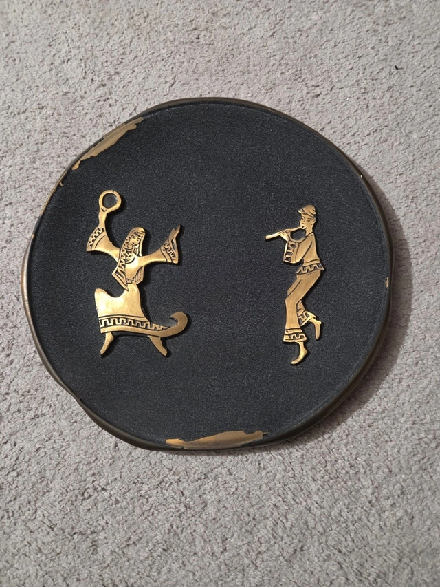 Elegant vintage handmade Greek decorative wall plaque with a black background and 24k gold-painted raised relief of classical Greek warriors. Features dynamic poses, Greek key details, and a mythological or heroic scene. It's about 12.5" in diameter and weighs around 600g. The plaque has 24k gold accents and a hanger on the back, ready to display. Condition is good vintage, with some edge chips and gold wear that add character, but no cracks. A timeless neoclassical accent for your home, office, or Mediterranean decor. Stunning contrast and detail!