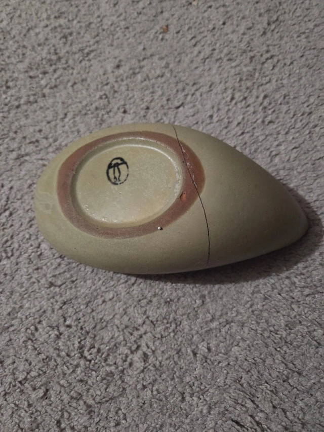 Cool vintage mid-century modern ceramic spoon rest (or small drip dish/trinket tray) – classic brown drip glaze over beige, teardrop/paisley shape! Style: MCM kitchenware (similar to Hull/McCoy brown drip lines) Size: 7.5" x 4", ~300g Features: Marked with script signature on base (GE or similar) Condition: Good vintage display – has a hairline crack on base (stable, no leaks), glaze wear as shown. Perfect retro accent for kitchen or MCM decor. Functional and nostalgic!