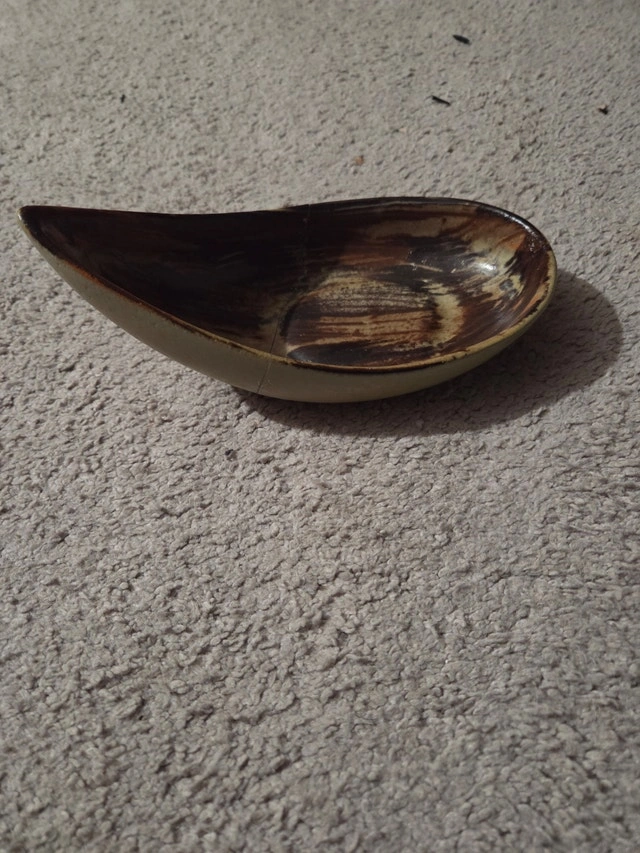 Cool vintage mid-century modern ceramic spoon rest (or small drip dish/trinket tray) – classic brown drip glaze over beige, teardrop/paisley shape! Style: MCM kitchenware (similar to Hull/McCoy brown drip lines) Size: 7.5" x 4", ~300g Features: Marked with script signature on base (GE or similar) Condition: Good vintage display – has a hairline crack on base (stable, no leaks), glaze wear as shown. Perfect retro accent for kitchen or MCM decor. Functional and nostalgic!