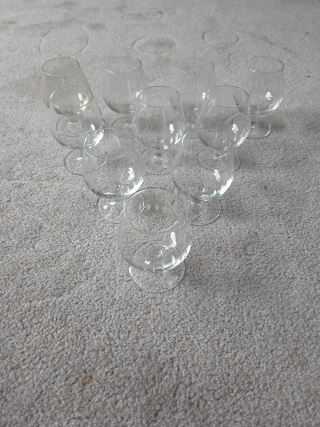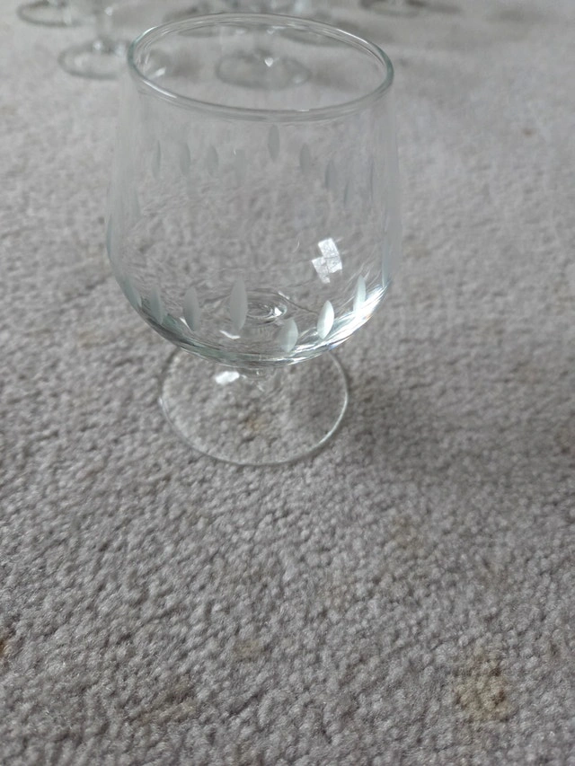 Elevate your home bar with this stunning set of 10 vintage brandy snifters. These feature a beautiful mid-century frosted etching of vertical ovals around the rim. The classic "balloon" shape is perfect for enjoying cognac, brandy, or your favorite liqueur. Complete set of 10 (hard to find in this quantity). Dimensions: 4" High x 2" Diameter (Rim). Style: Mid-Century Modern (1960s/70s). Condition: Excellent vintage condition. No chips, cracks, or clouding to the glass. Design: Delicate etched/frosted pattern with a short stem and sturdy base.