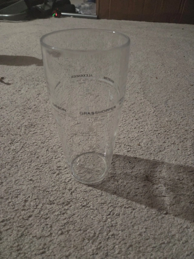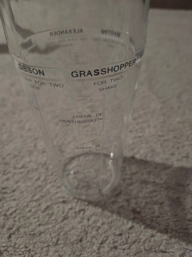 Add a touch of retro charm to your bar cart with this vintage glass cocktail recipe mixer. Featuring high-contrast black and white graphics, it includes full recipes and measurements for 6 classic cocktails. Recipes Included: Alexander, Martini, Whiskey Sour, Manhattan, Grasshopper, and Gibson. Features: Integrated measurement lines for 2 or 4 servings. Style: Mid-Century Modern (MCM). Dimensions: 7" Tall, 3" Diameter. Condition: Excellent vintage condition with very clear, crisp graphics and no chips or cracks.