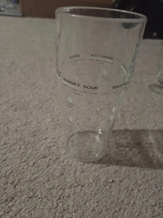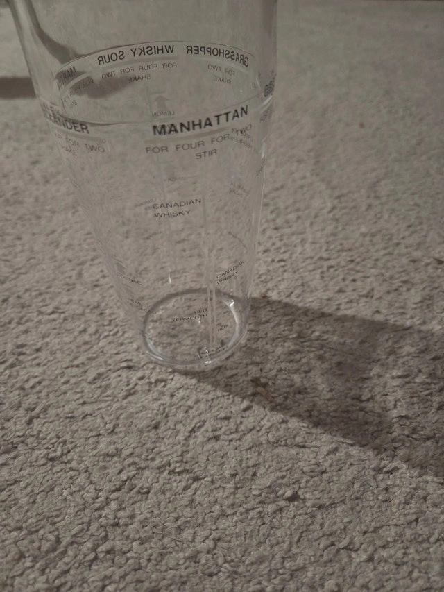 Add a touch of retro charm to your bar cart with this vintage glass cocktail recipe mixer. Featuring high-contrast black and white graphics, it includes full recipes and measurements for 6 classic cocktails. Recipes Included: Alexander, Martini, Whiskey Sour, Manhattan, Grasshopper, and Gibson. Features: Integrated measurement lines for 2 or 4 servings. Style: Mid-Century Modern (MCM). Dimensions: 7" Tall, 3" Diameter. Condition: Excellent vintage condition with very clear, crisp graphics and no chips or cracks.