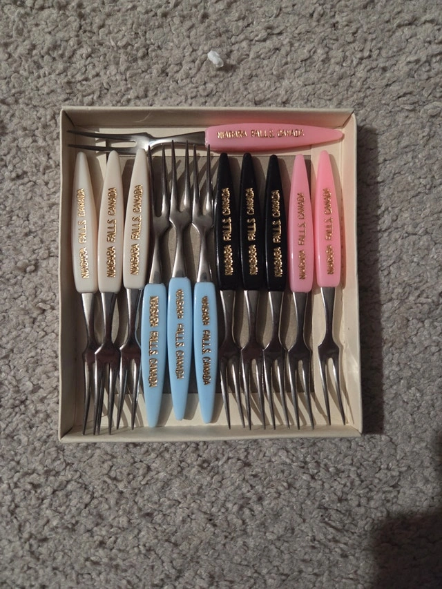 - 12 Vintage Niagara Falls souvenir appetizer forks (Complete boxed set)