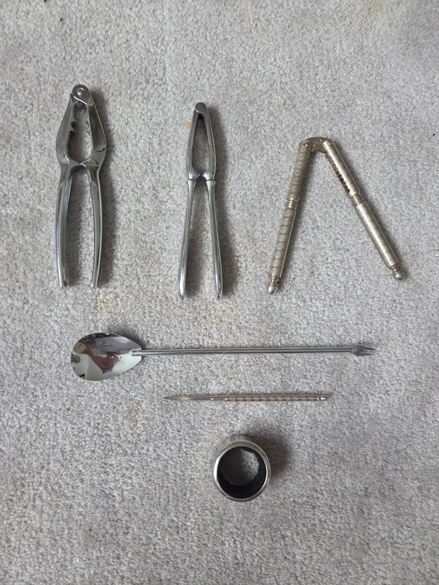 CONDITION: All pieces are in excellent vintage condition. The glass is clear with no chips or cracks, and all mechanical tools are in smooth working order.