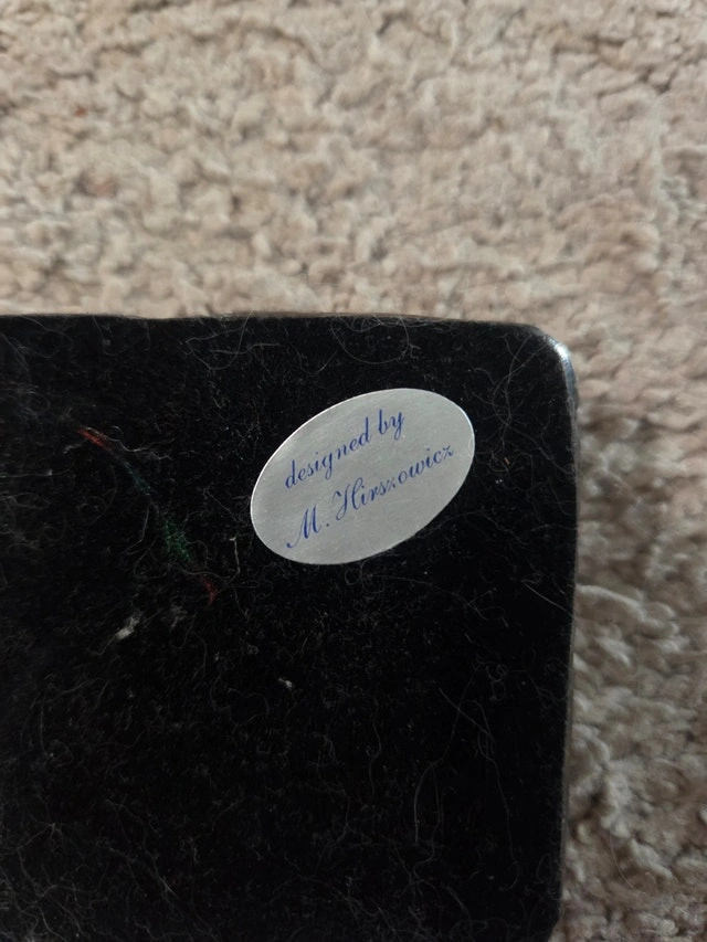 A heavy, high-quality vintage silver-plated matchbox sleeve/cover designed by the renowned modernist artist Miriam Hirszowicz. This is a true designer piece, featuring a stunning Art Deco-style engine-turned "pyramid" pattern and an ornate floral accent. Designer: Miriam Hirszowicz (Original label on the felt base). Weight: 100g (Substantial, weighted feel). Size: Approx. 2.5" (Fits standard large matchboxes). Style: Mid-Century Modern / Brutalist. Function: Slides over a matchbox to serve as a sophisticated desk or coffee table accessory. Condition: Excellent vintage condition with a beautiful aged patina.