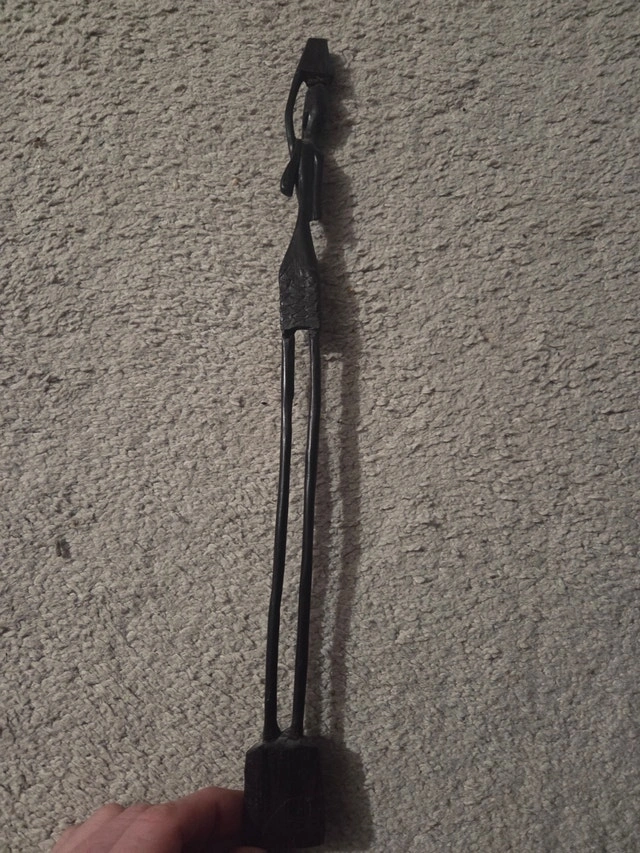 A stunning, tall vintage hand-carved sculpture in solid African Ebony. This 15.5-inch piece depicts a woman in a graceful, elongated "skinny" style balancing a traditional water jug on her head—a timeless symbol of life, sustainability, and daily grace in African village culture. Key Details: Subject: An elegant "Water Bearer" figure with a beautifully stylized, minimalist silhouette. Height: Impressive 15.5 inches tall—a perfect statement piece for a shelf, mantel, or Mid-Century Modern decor. Material: Carved from a single piece of genuine, high-density African Ebony (or Ironwood). It features a rich, dark natural patina and is heavy and solid for its size. Design: Intricate carved detailing on the clothing/mid-section contrasts with the smooth, polished limbs. Condition: Excellent vintage condition. Solid with no cracks or chips. This is a classic example of traditional folk art that fits perfectly with Boho or MCM aesthetics.