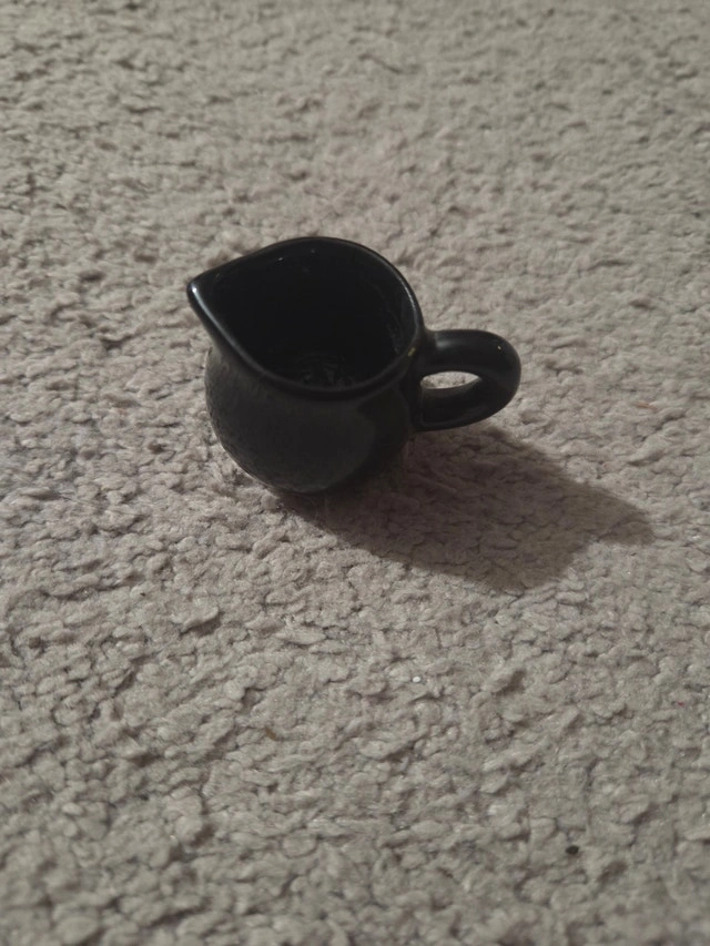 A charming vintage miniature pitcher/creamer in a deep glossy black glaze. Standing approximately 1.5"–2" tall, this diminutive piece features a classic rounded body and a robust handle. Size: Approx. 2" H Color: Solid High-Gloss Black Condition: Excellent vintage condition with no visible chips or cracks. Design: Traditional creamer silhouette, perfect for dollhouse displays, miniature collections, or use as an individual syrup/cream server for a breakfast tray. A simple, elegant addition to a "boudoir" vanity display or a shelf of art pottery. Happy to include this as a throw-in depending on what else you purchase from my listings.
