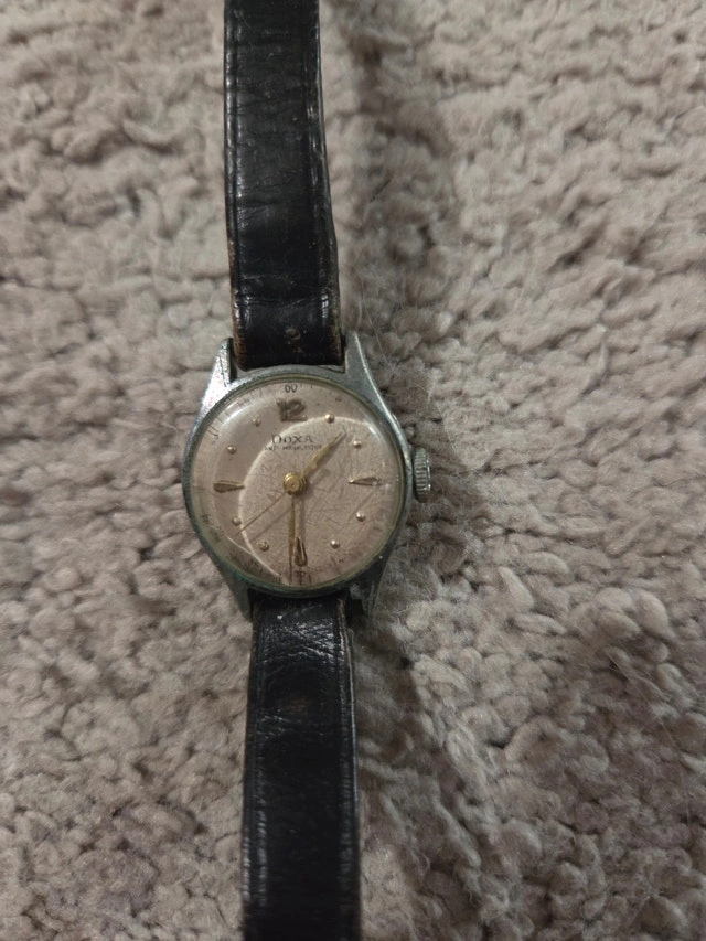 Classic mid-century Doxa Anti-Magnétique Swiss-made watch. This is a traditional manual-wind mechanical timepiece, not a quartz/battery watch. Brand: Doxa (Swiss) Movement: Mechanical (Manual Wind) Condition: Sold As-Is. I have not attempted to wind or service it. Dial: Original aged patina with gold-tone markers. Ideal for a collector, hobbyist, or as a high-quality parts piece for a restoration project.
