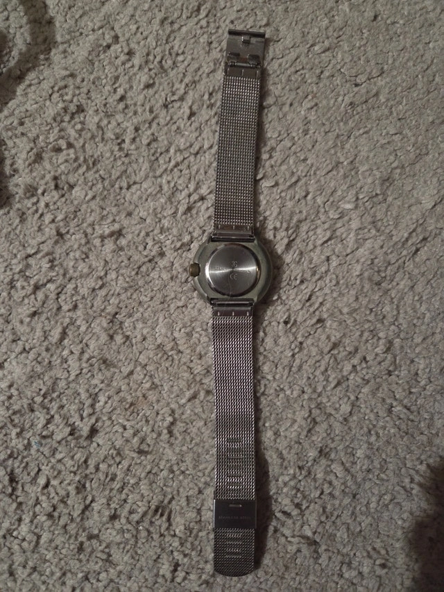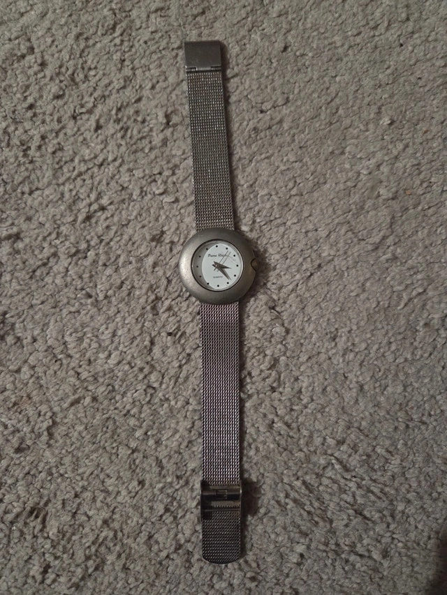 Retro fashion watch by Pierre Rucci with a modern, minimalist look. Features a unique round silver-tone case and a comfortable stainless steel mesh strap. Brand: Pierre Rucci. Movement: Quartz (Battery operated). Band: Adjustable stainless steel mesh band in good condition. Needs a new battery. Good vintage condition otherwise. There are minor visible scratches, and there is some wear on the bezel consistent with vintage use. A great, affordable accessory for a retro look or for parts.