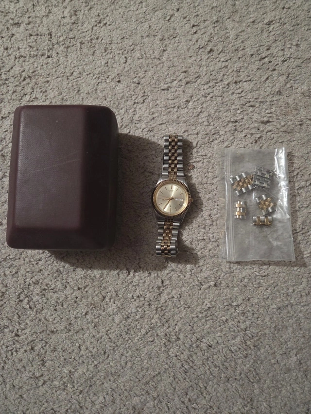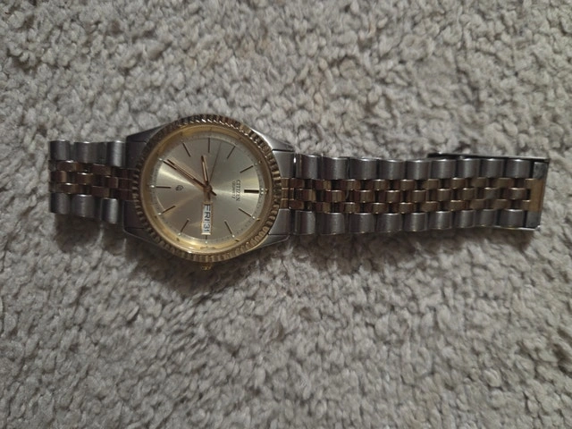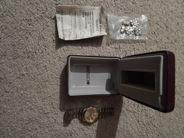 A rare, investment-grade Citizen Quartz (Model 1102-S023017) in exceptional, fully functional condition. This is not just a watch; it is a complete time-capsule set including all original accessories. Fully Working with a brand-new battery just installed. The movement keeps perfect time. Pristine gold-and-silver finish with zero fading or plating wear. The fluted bezel and jubilee bracelet are sharp and vibrant. The "Full Kit" Includes: Original Citizen presentation box, Original instruction manual/booklet, Original extra bracelet links for easy resizing. Features: Elegant fluted bezel, Jubilee-style bracelet, and Day/Date complication. This is a premium, ready-to-wear piece for a serious collector or someone looking for a high-end vintage aesthetic without the "project watch" risks. For Sale By: Owner