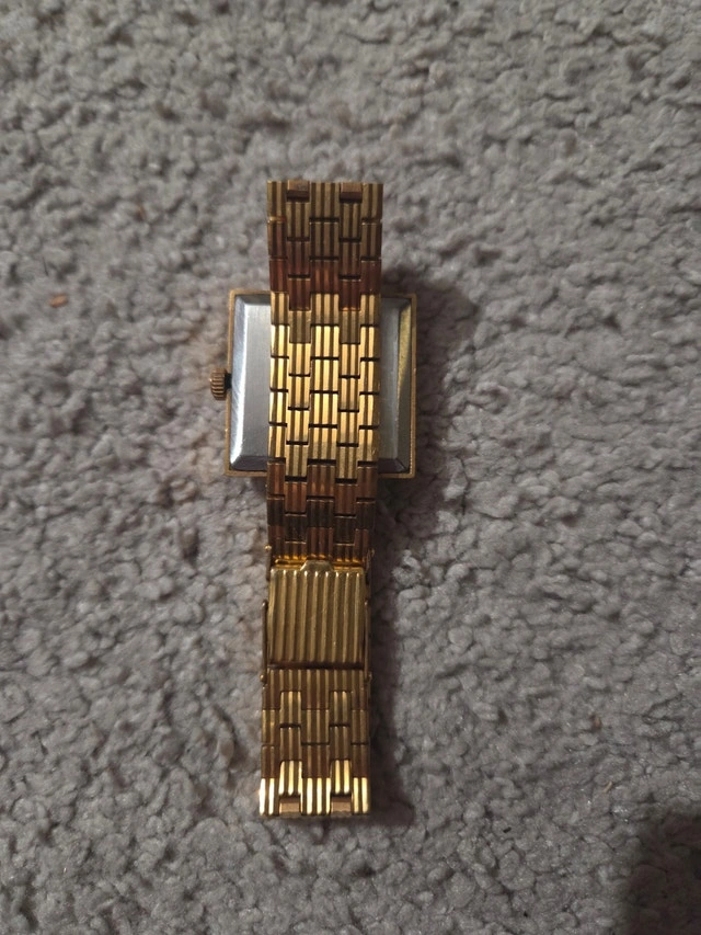 Case: Square gold-plated case with a classic textured dial.