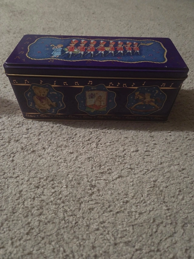 Add a touch of nostalgic charm to your holiday decor with this beautiful vintage Cadbury chocolate/biscuit tin from the late 80s/early 90s. This rectangular purple metal tin features a classic festive parade scene with toy soldiers, teddy bears, and rocking horses. Details: Brand: Authentic Cadbury Collectible. Dimensions: 8.75" L x 3.75" W x 3.5" H. Graphics: Vibrant purple base with Victorian-style illustrations and musical note accents along the sides. Condition: Very clean interior (gold-tone). Outside shows minor vintage wear consistent with age, but graphics remain bright and display beautifully. Perfect for holiday gift-giving, cookie storage, or as a nostalgic accent piece for collectors of vintage advertising and Christmas decor. More Info: Vintage, Antiques For Sale By: Owner