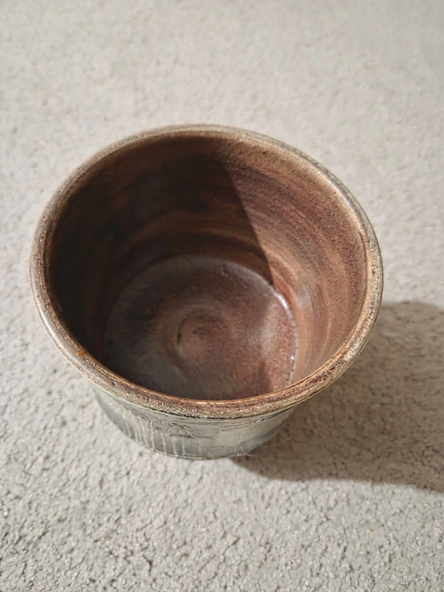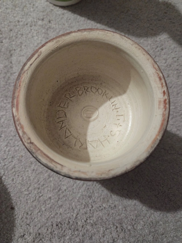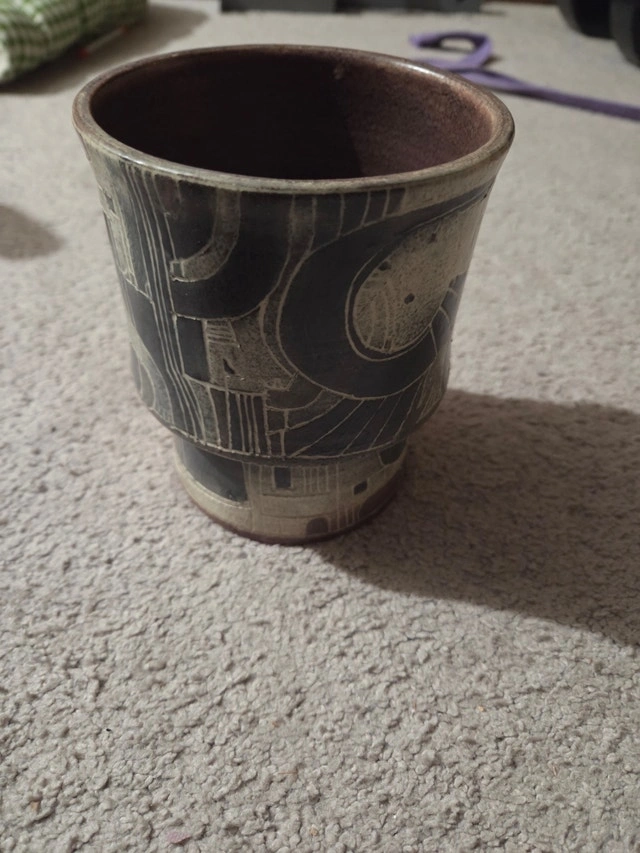 Substantial and highly collectible piece of Canadian Mid-Century Modern art pottery from the renowned Brooklin Pottery Studio. This is a signature collaboration between Theo and Susan Harlander, featuring Susan’s iconic hand-incised figurative sgraffito work. Artist: Theo & Susan Harlander (Marked on base) Technique: Sgraffito earthenware with figurative abstract design Dimensions: 6" H x 5" Dia Weight: 850g (Very solid, heavy-bottomed vessel) Condition: Excellent vintage condition. No chips or cracks. Markings: Incised "S. Harlander Brooklin Ont" with the studio's early "h" monogram. A museum-quality piece (Harlander work is held in the permanent collection of the Gardiner Museum) that fits perfectly in any MCM or Canadian art collection. Vintage, Antiques. For Sale By: Owner.