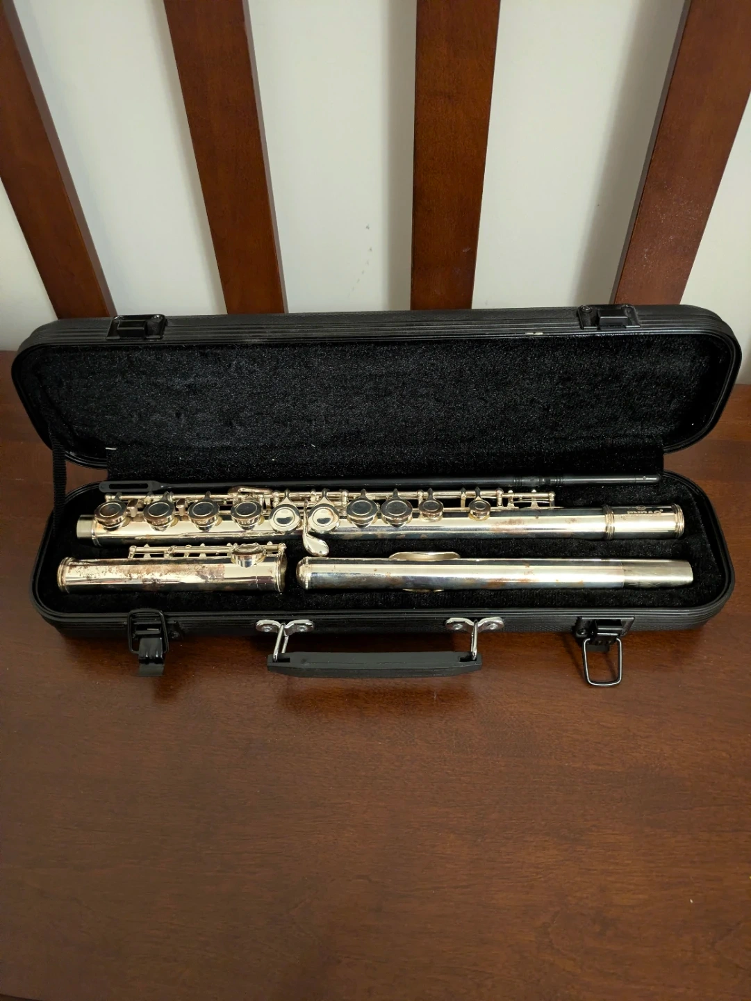 This is a silver flute, likely for a beginner or student. It's in a protective original hard case. It shows some signs of tarnishing but appears to be functional. Includes cleaning rod.
