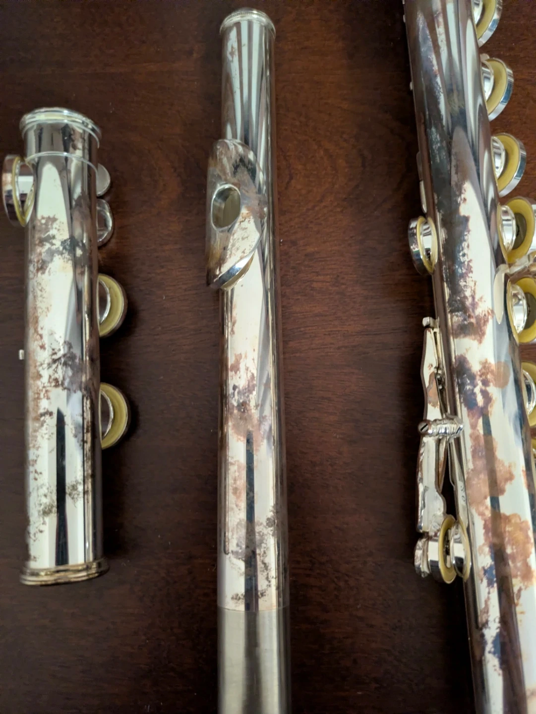 The flute was bought in 2020 end of January for my grade 7 child then school was all closed in February due to COVID. So, the flute was never used. The tarnish was from storage all these years.