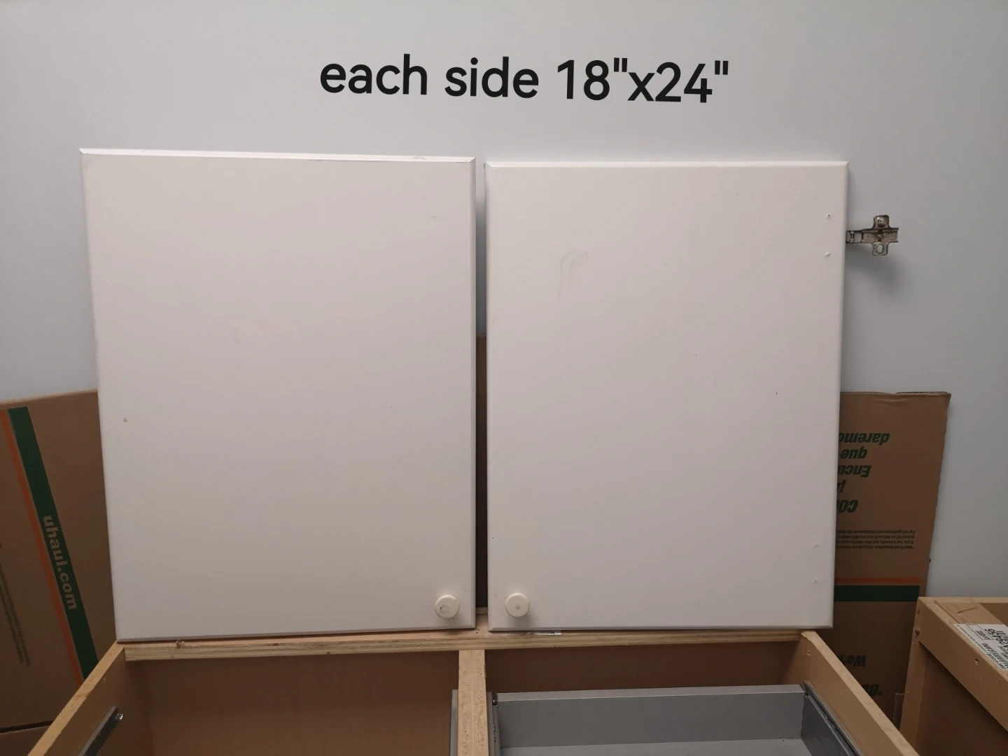 Two white cabinet doors. Each side measures 18 inches by 24 inches. These are standard cabinet doors, likely for a kitchen or bathroom renovation. They are white and appear to be made of a durable material. Ready to install on your existing cabinets!