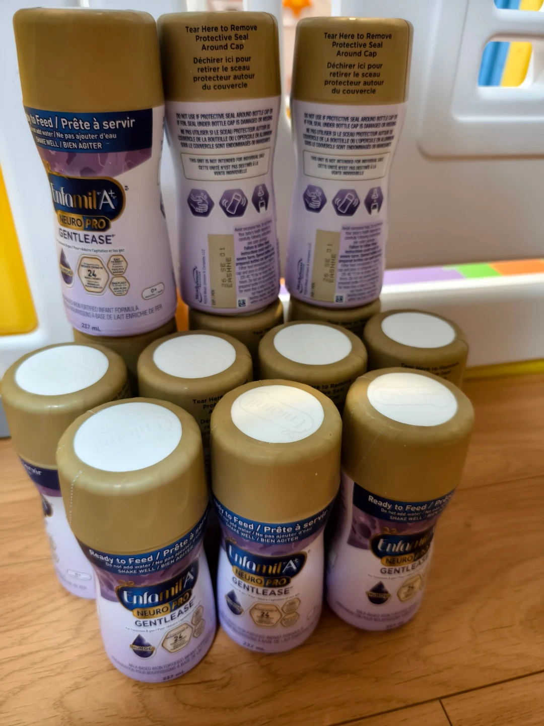13 ready-to-feed Enfamil A+ Neuro Pro Gentlease bottles. Each bottle contains 237 mL of infant formula. HuMO6 and DHA Plus are included ingredients.