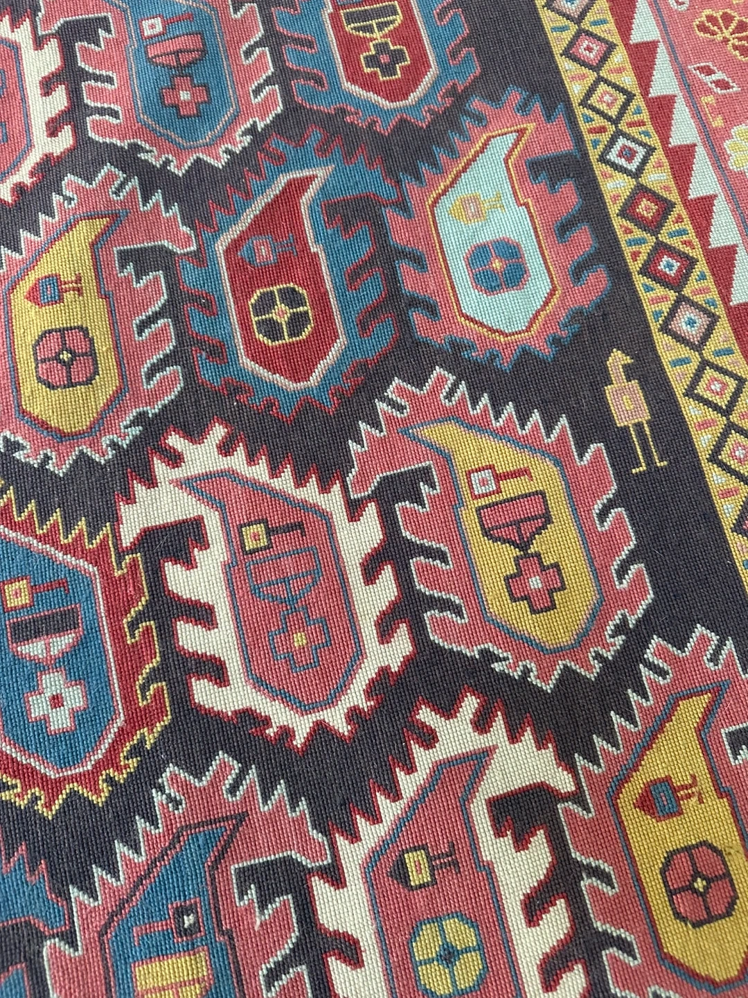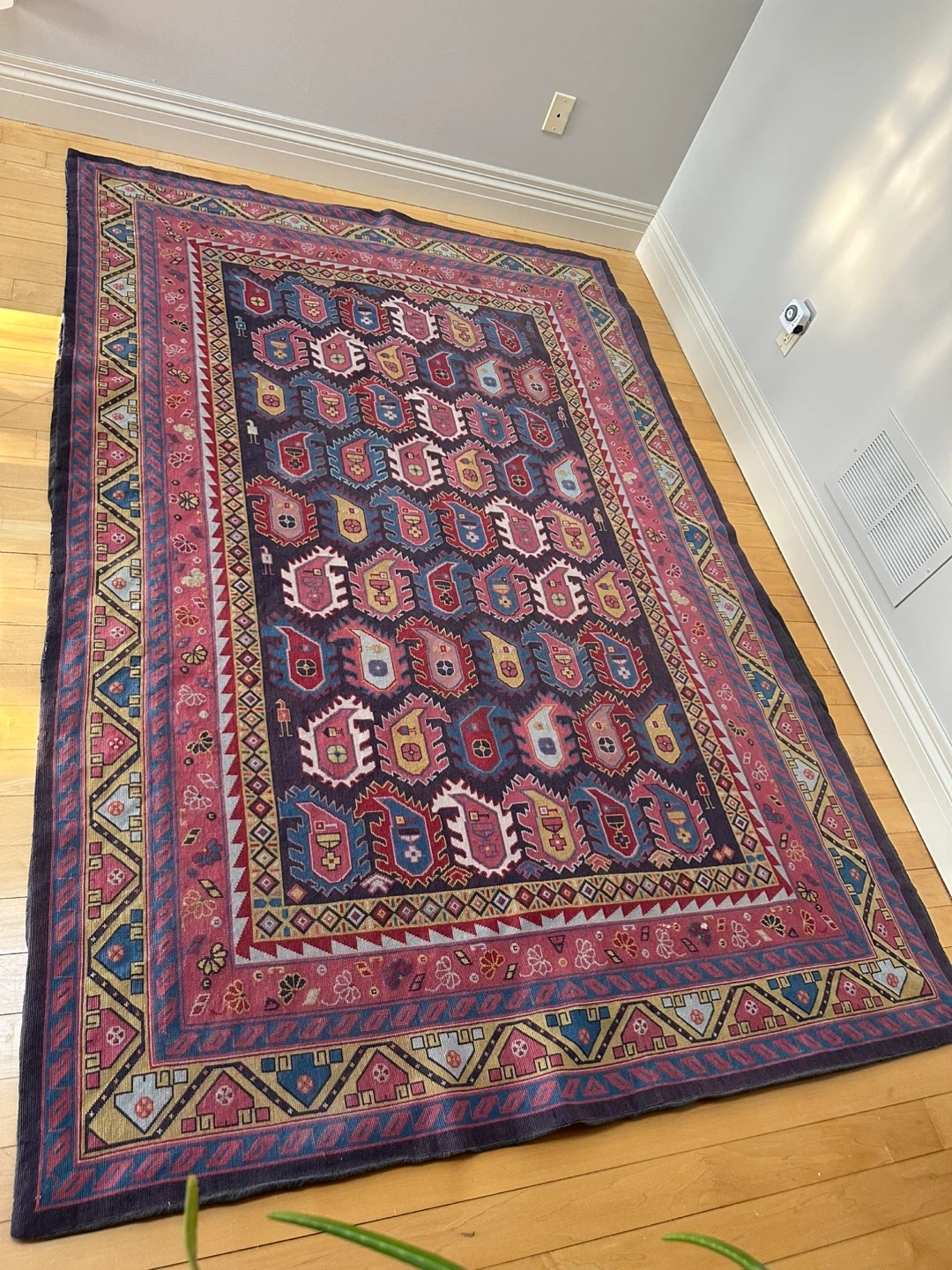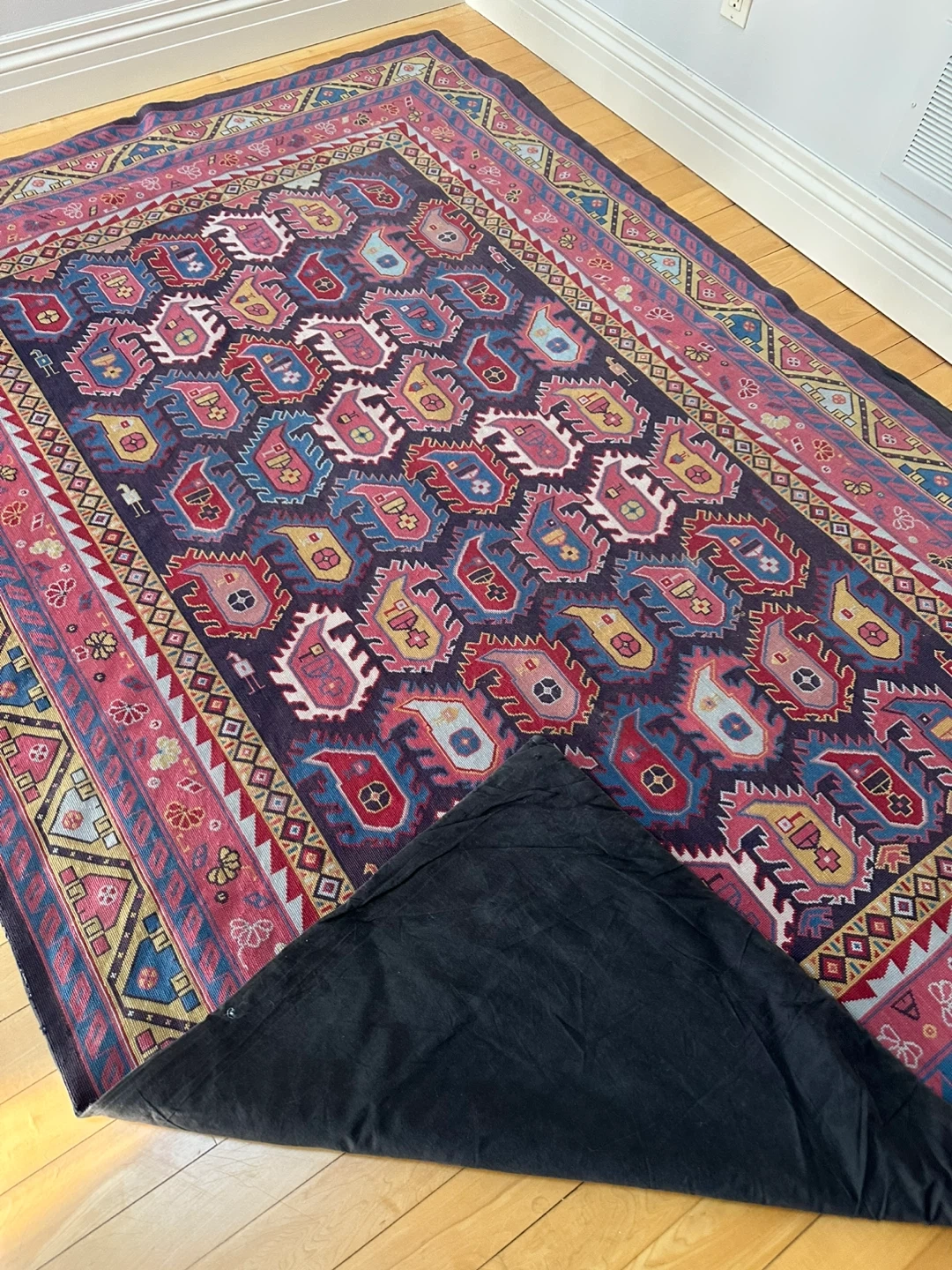 A Antique Turkish rug with a striking geometric pattern in shades of deep blue, pink, and yellow. Measurements are approximately 8x5 ft