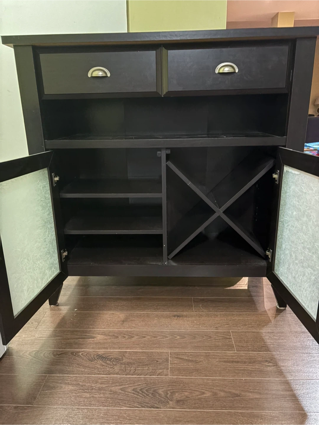This dark brown storage cabinet features two drawers and two doors with decorative glass inserts. Inside, there's shelving and a wine rack. It's great for organizing your living space or dining area.