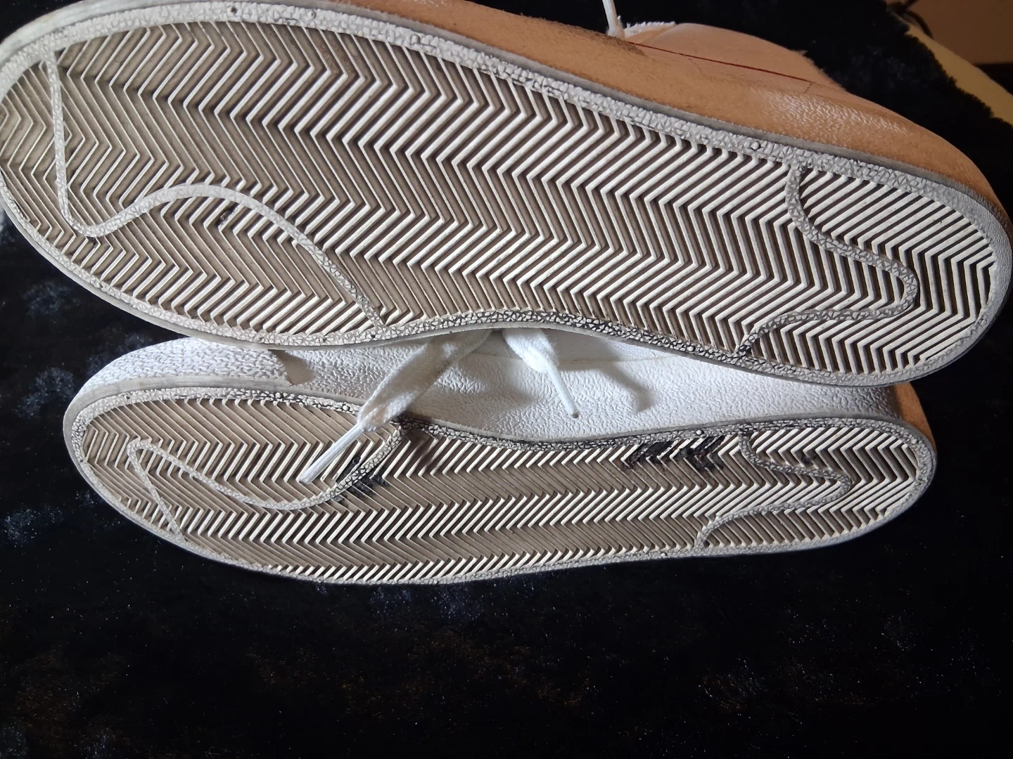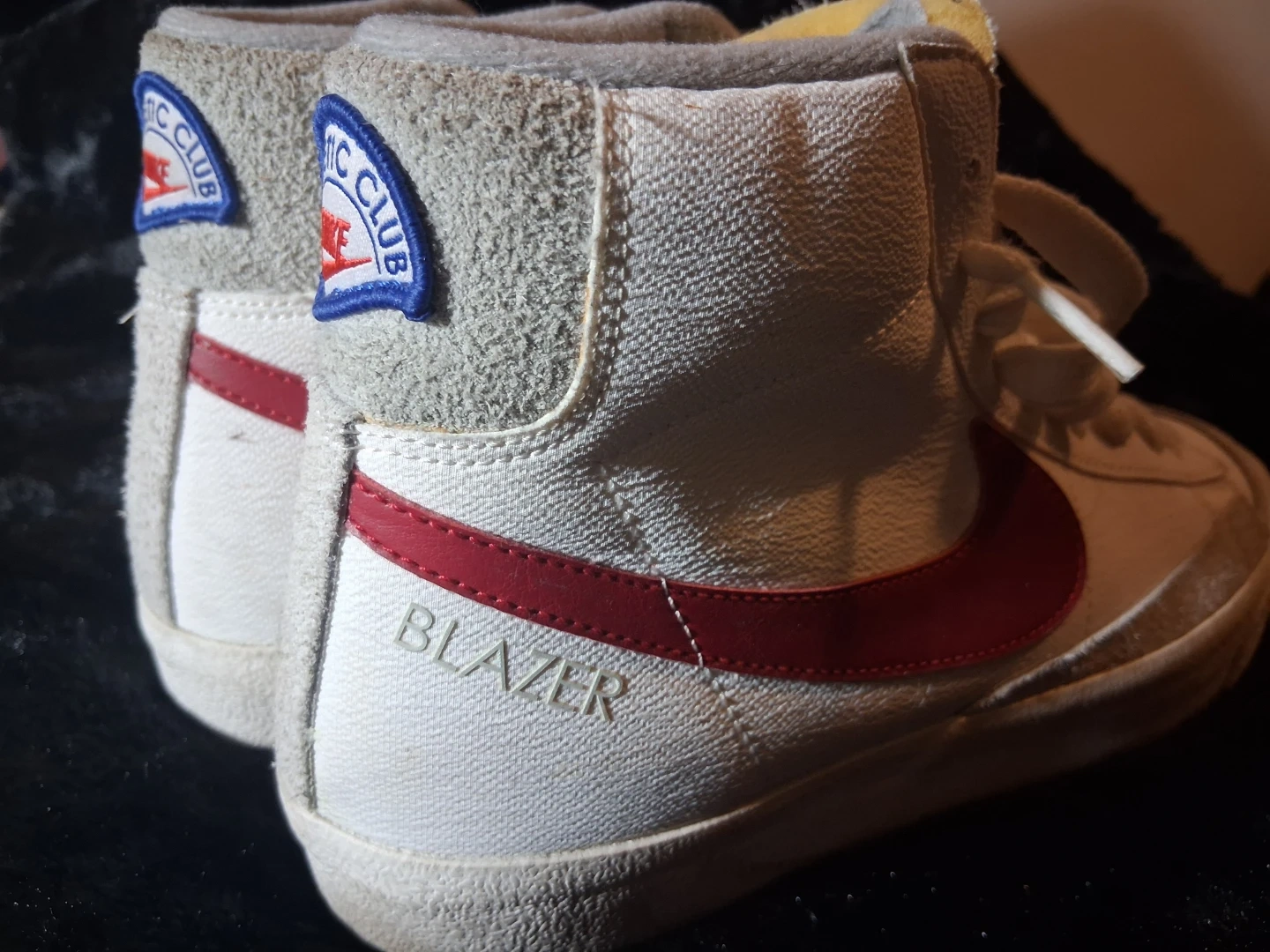 These are Nike Blazer Mid sneakers with an Athletic Club patch. White leather with red accents and a rubber sole. Classic high-top basketball shoe style.