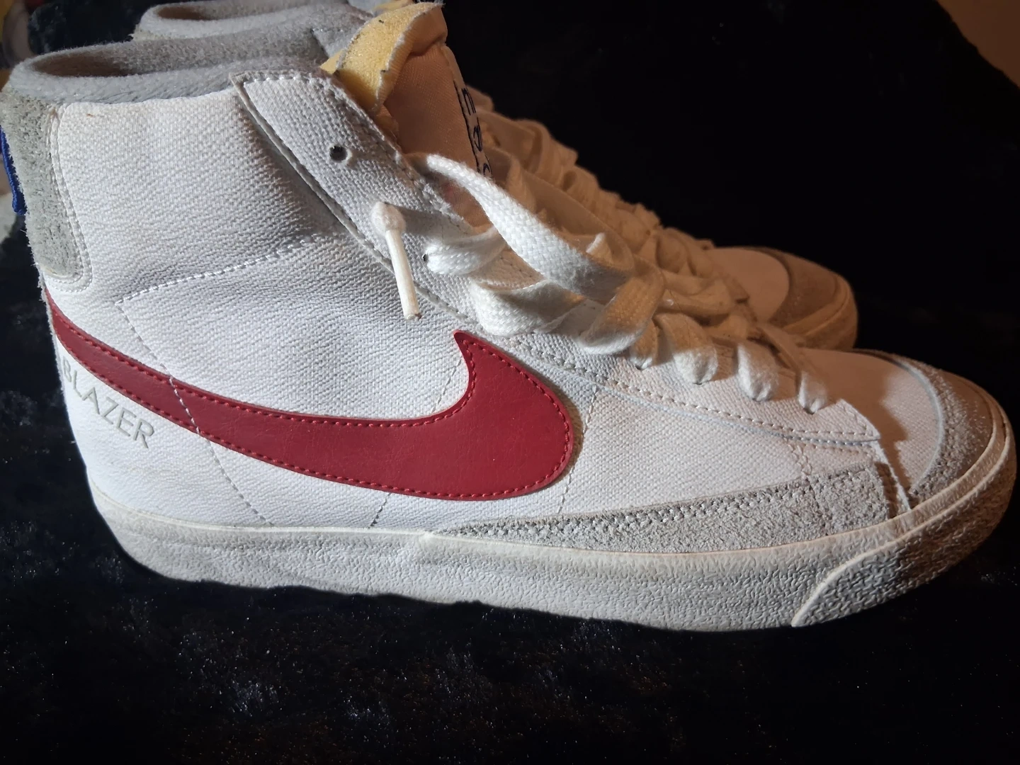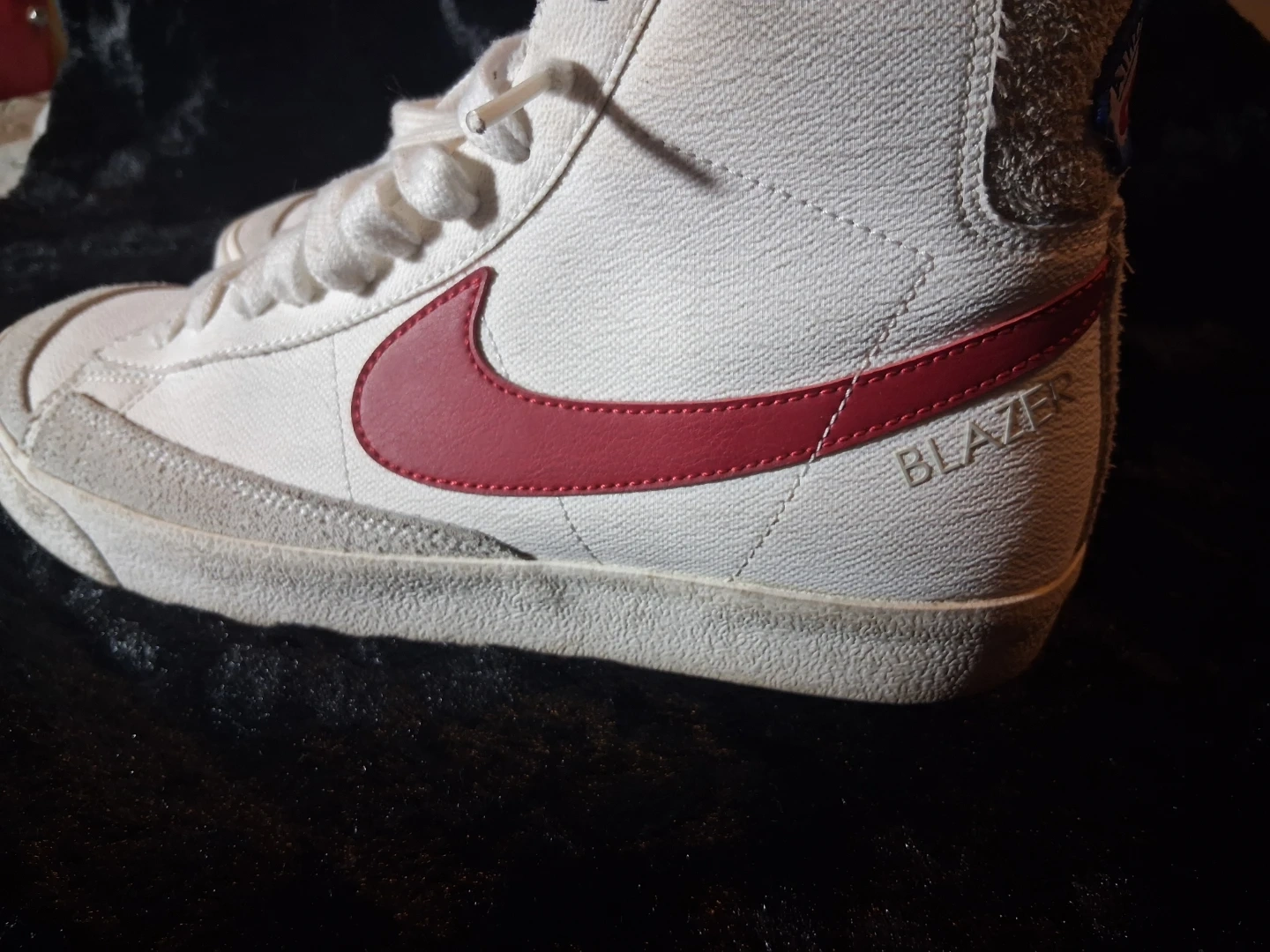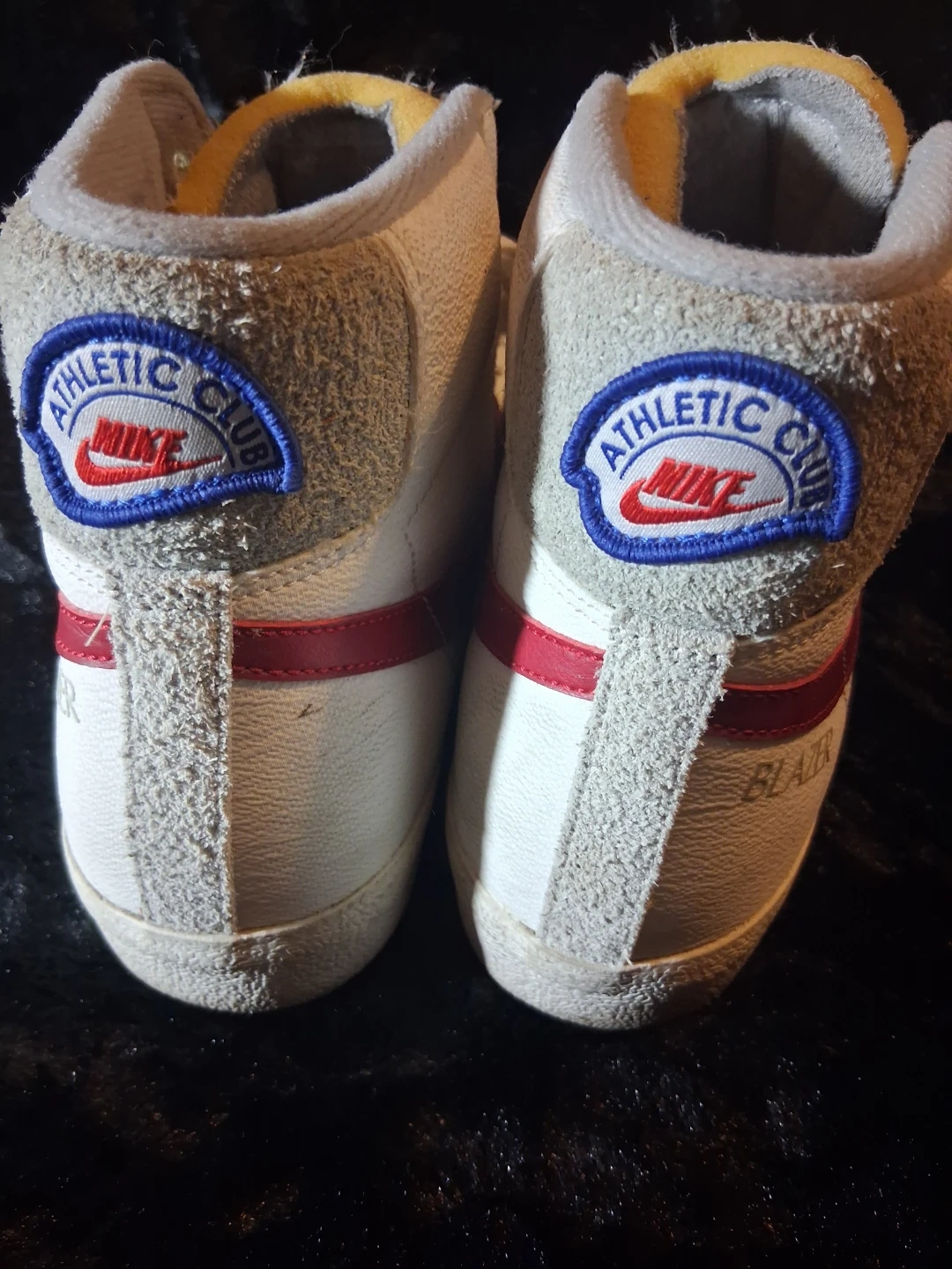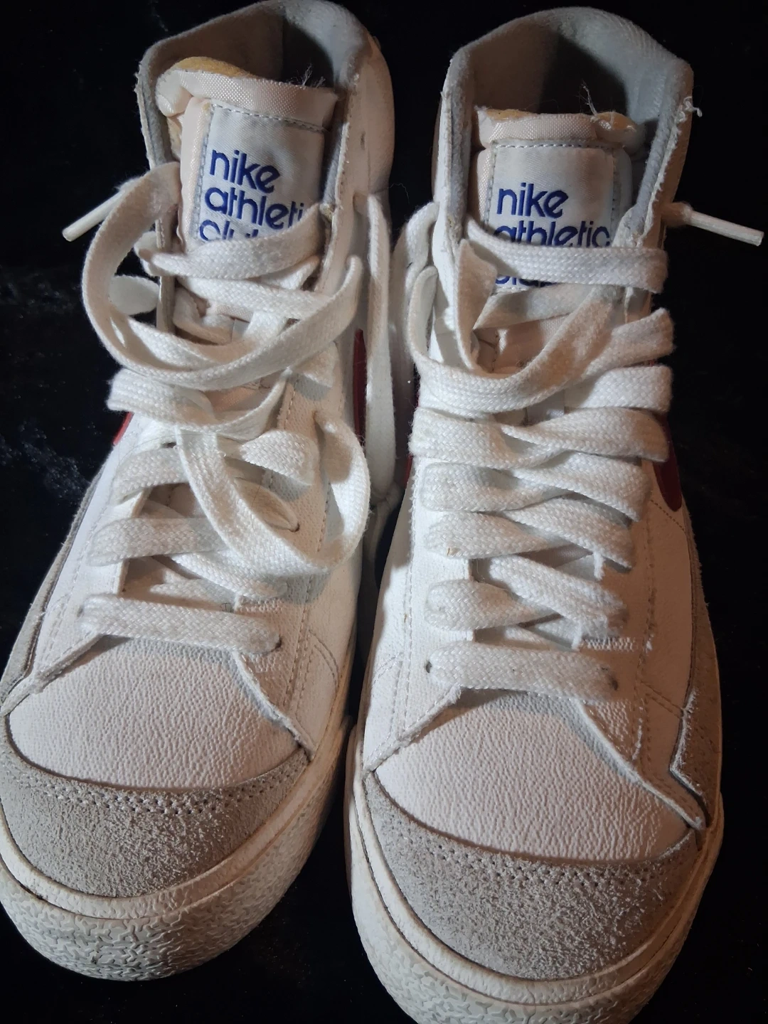 These are Nike Blazer Mid sneakers with an Athletic Club patch. White leather with red accents and a rubber sole. Classic high-top basketball shoe style.