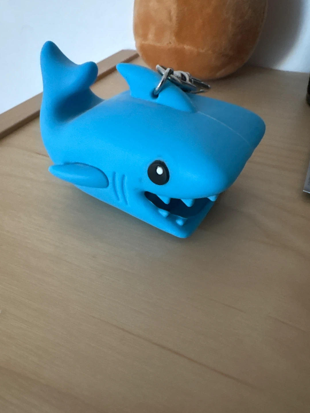 This is a blue shark-shaped keychain holder. It's made of a flexible material and has a clip for attaching to bags or belts. It's perfect for keeping small items like lip balm or hand sanitizer secure and accessible!