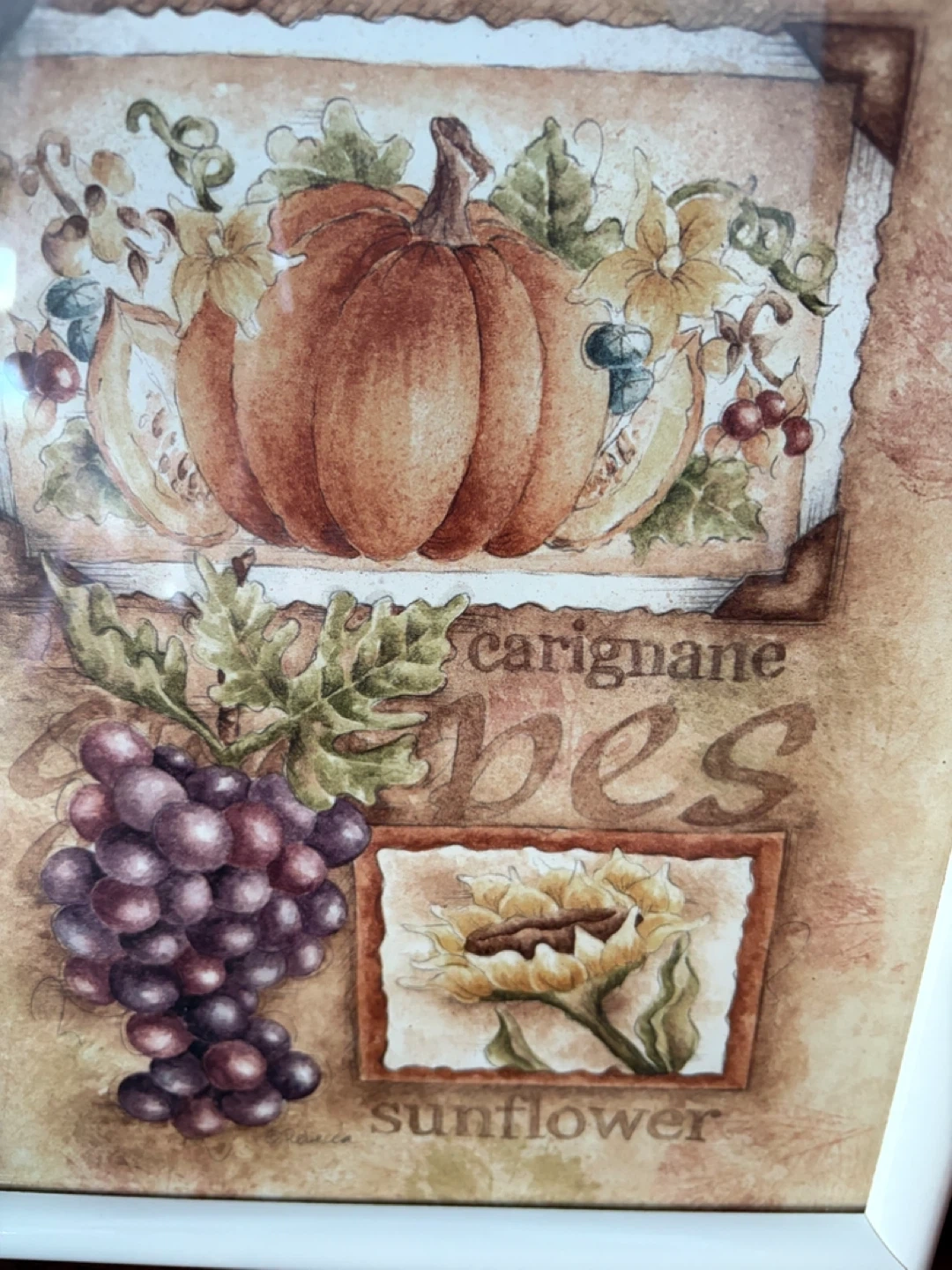 Adorn your kitchen/dining area with this Tuscan styled harvest themed picture. Pumpkin, grapes and a sunflower in rustic subtle tones.