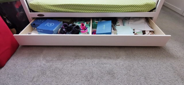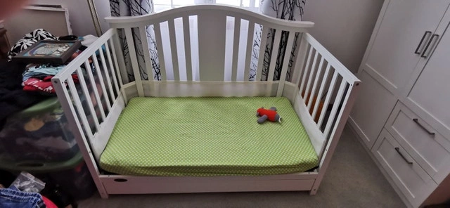 Barely used, in very good condition. This is a 4-in-1 convertible crib that can transform from a crib to a daybed to a double bed. It also features a sliding drawer as seen in the pictures. Originally $249 at Walmart. Asking $100 or best offer.